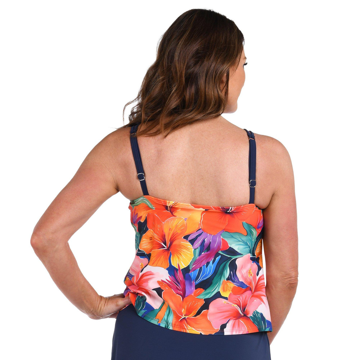 This tankini top bursts with vibrant, oversized hibiscus flowers in bold shades of red, pink, and orange, complemented by lush green leaves against a dark backdrop. A high-neck design showcases your shoulders, drawing the eye upward to create a balancing effect. Removable cups with underwires and adjustable straps provide plenty of support. Fabrication 82% nylon, 18% Lycra Xtra Life elastane