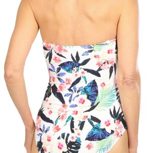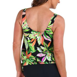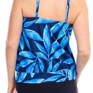Featuring bold geometric floral shapes in vibrant shades of blue, coral, and purple, this tankini top offers a dynamic, layered, and abstract design. Styled with a flattering scoop neck, this swim top features molded cups and thick, over-the-shoulder straps that keep you comfortably supported. Fabrication 82% nylon and 18% Lycra.