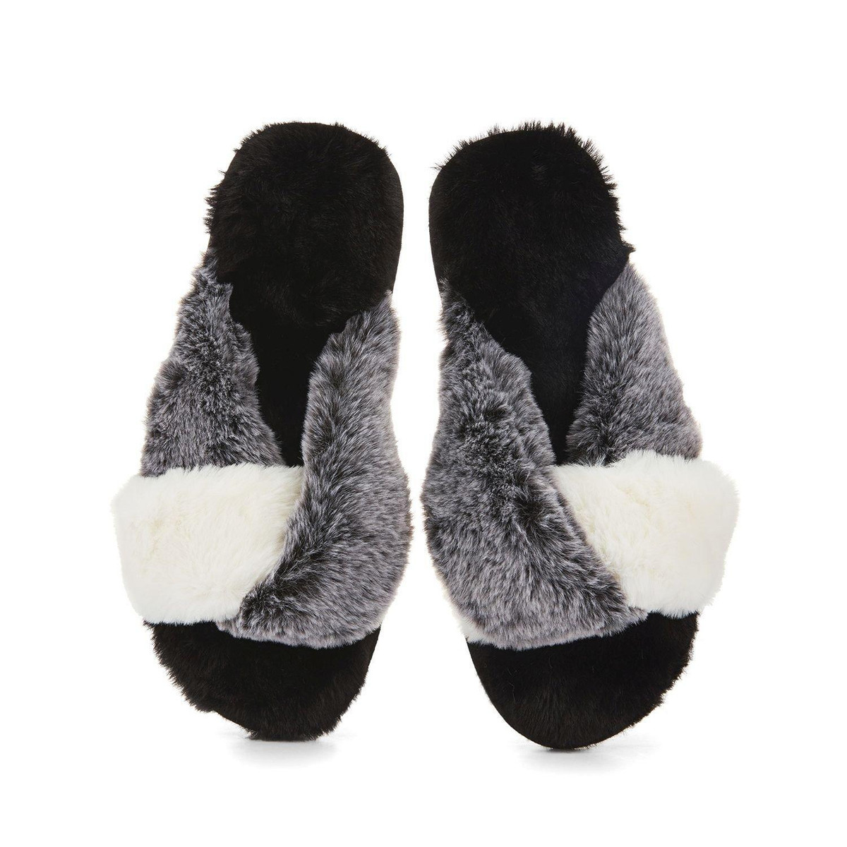 Our Rita Slippers combine classic Hollywood starlet fashion with high quality comfort for a pair of slippers you’ll always want to wear. This multi-tonal open toe pair has a memory foam insole and is covered in plush faux fur in a looped halter design.