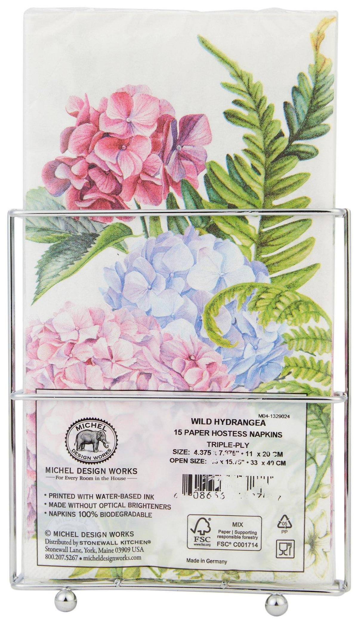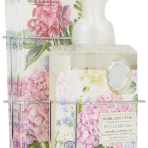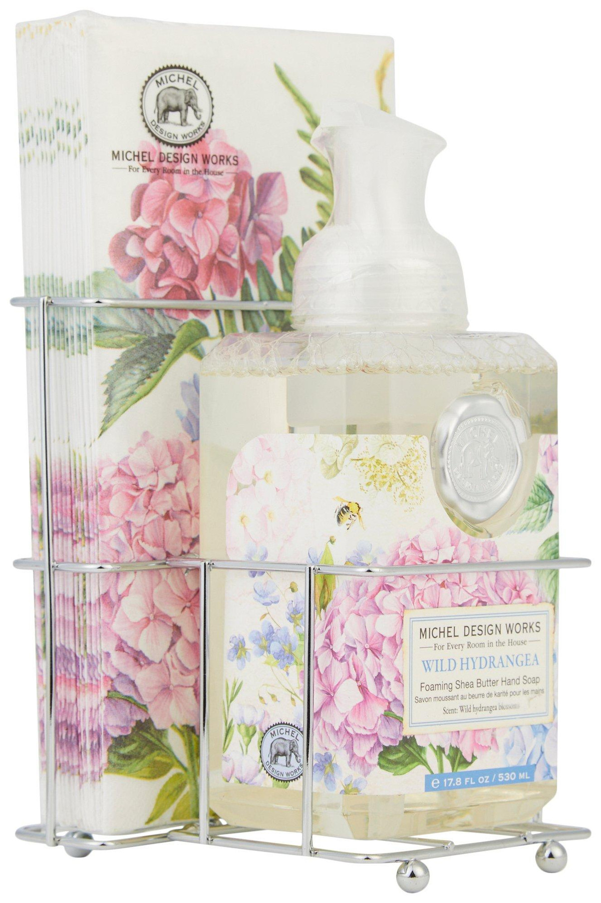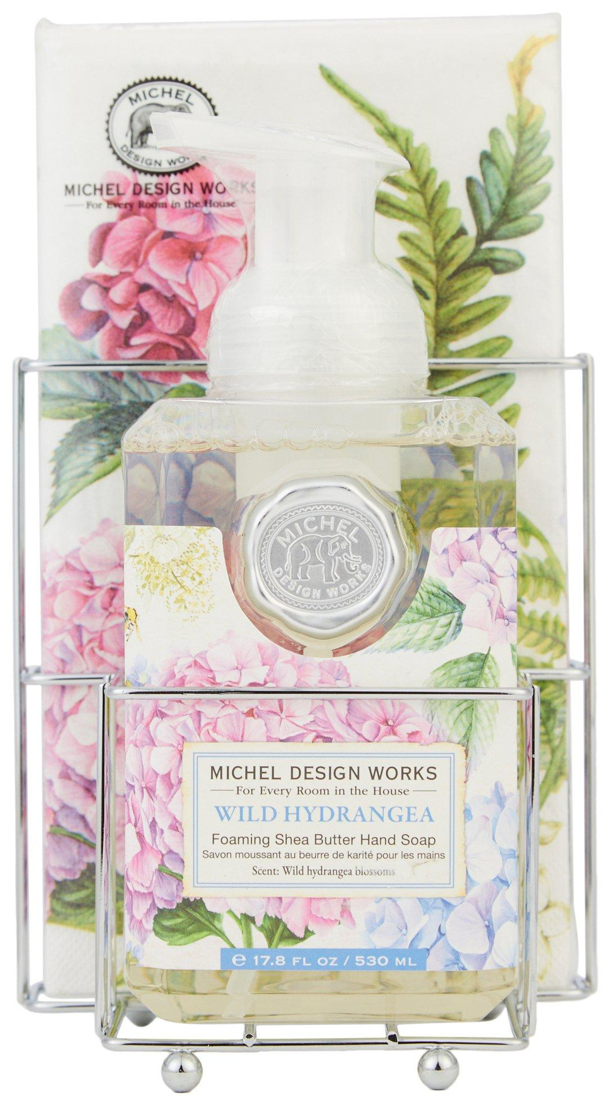 Hydrangeas bring unbridled beauty and tranquility to any occasion thanks to our attractive silver-toned caddy, which holds our beloved foaming hand soap and matching paper hostess napkins. A delightful addition to indoor spaces, this soap dispenser set is sure to accent counters with its neat, compact design that showcases the products lovely look.Includes one foaming hand soap 17Oz. and 15 napkins