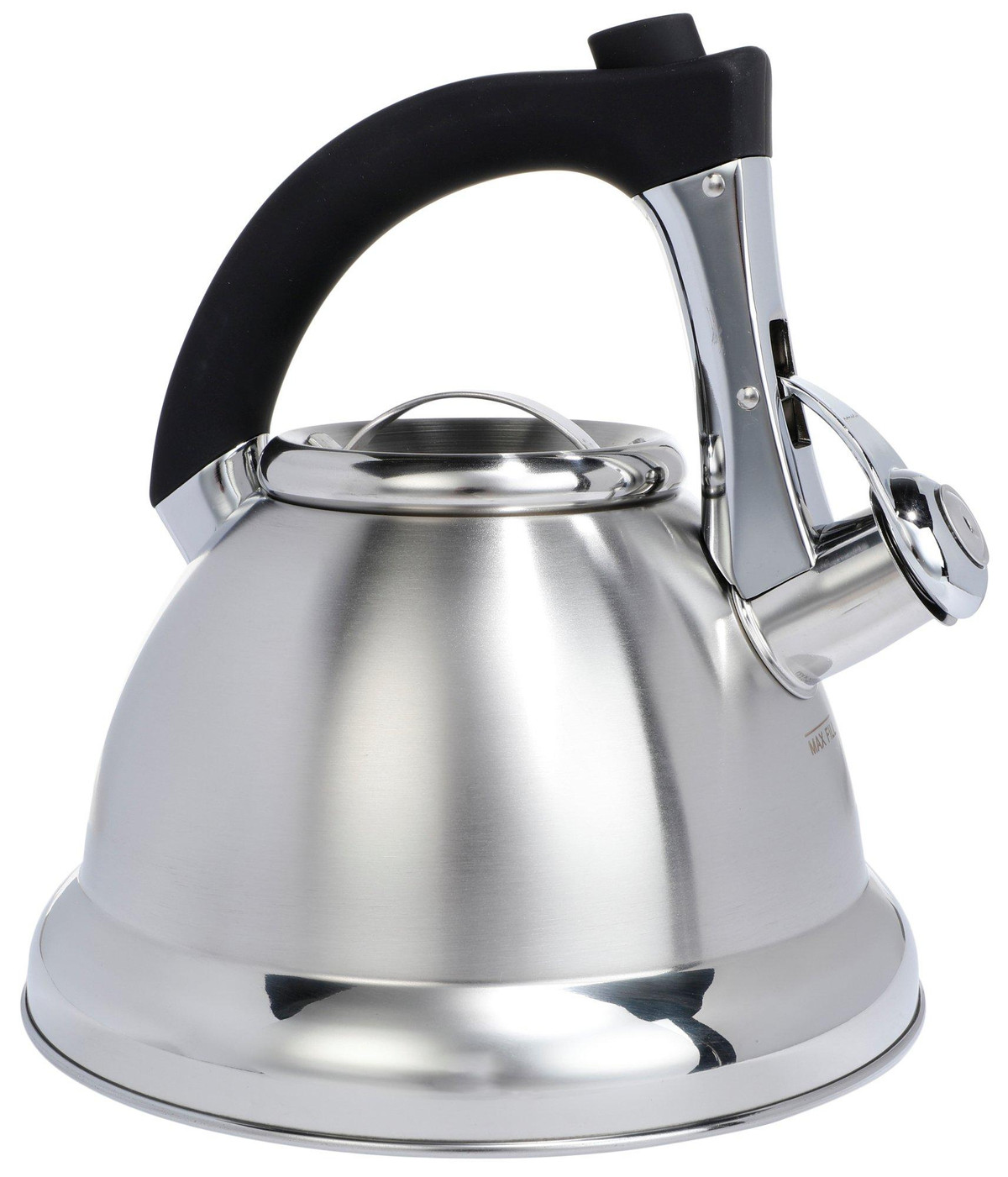 This simple and sleek tea kettle is made of high-quality stain and rust resistant stainless steel. It features an ergonomic handle for comfortable grip, as well as a push button to trigger the flip-up spout cover for an easy and effortless use. Perfect for coffee, tea or hot chocolate! Holds 2.4 quarts.