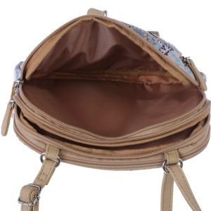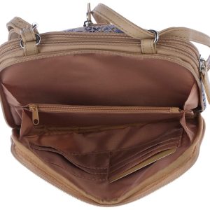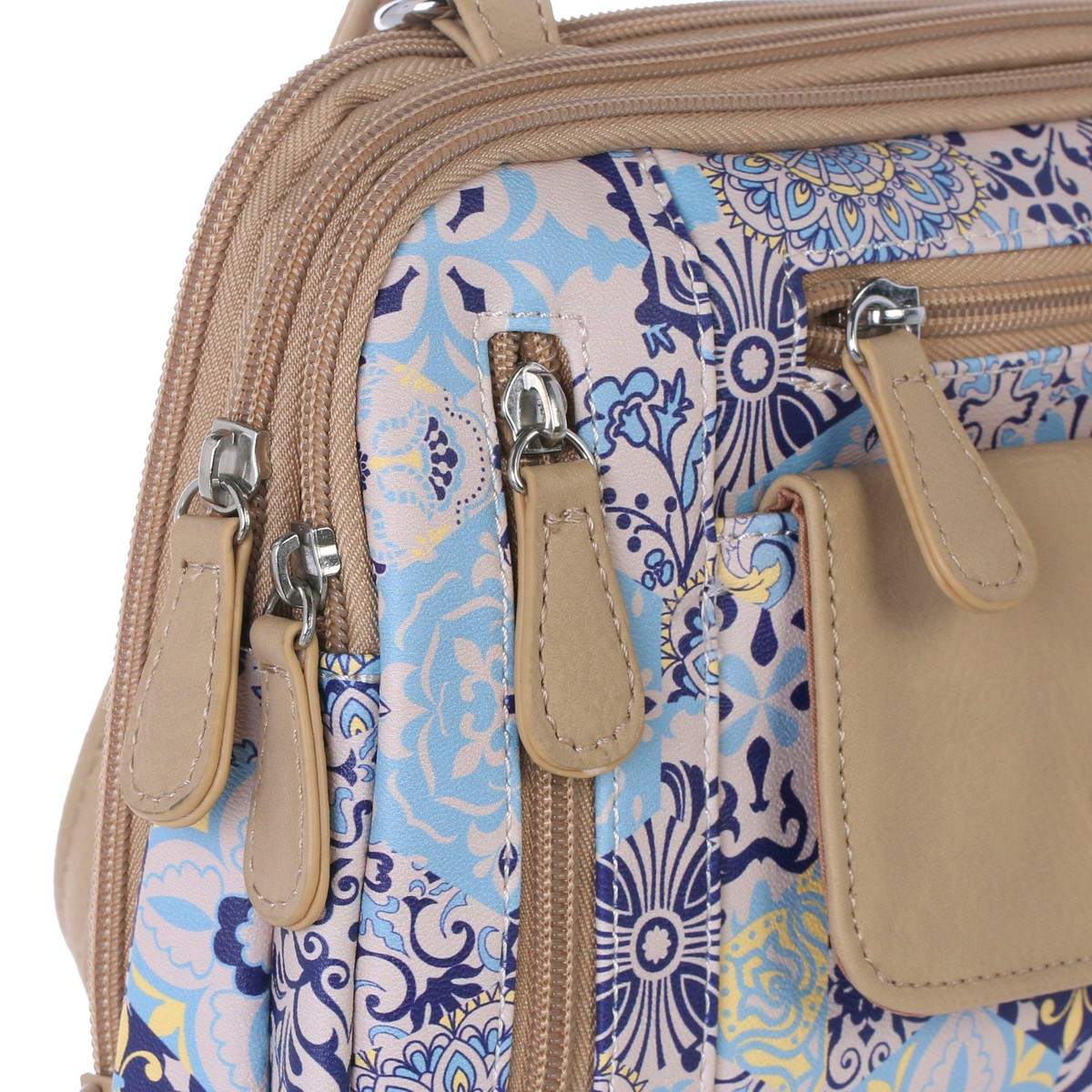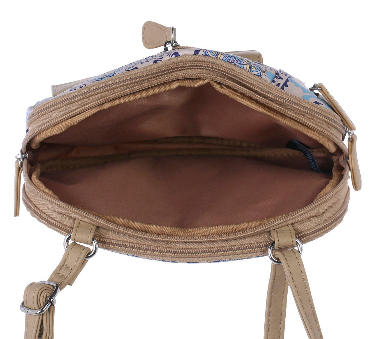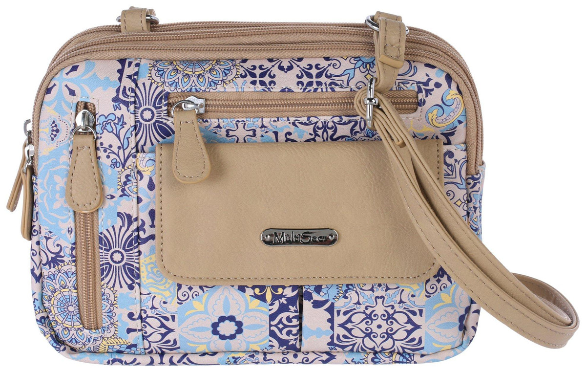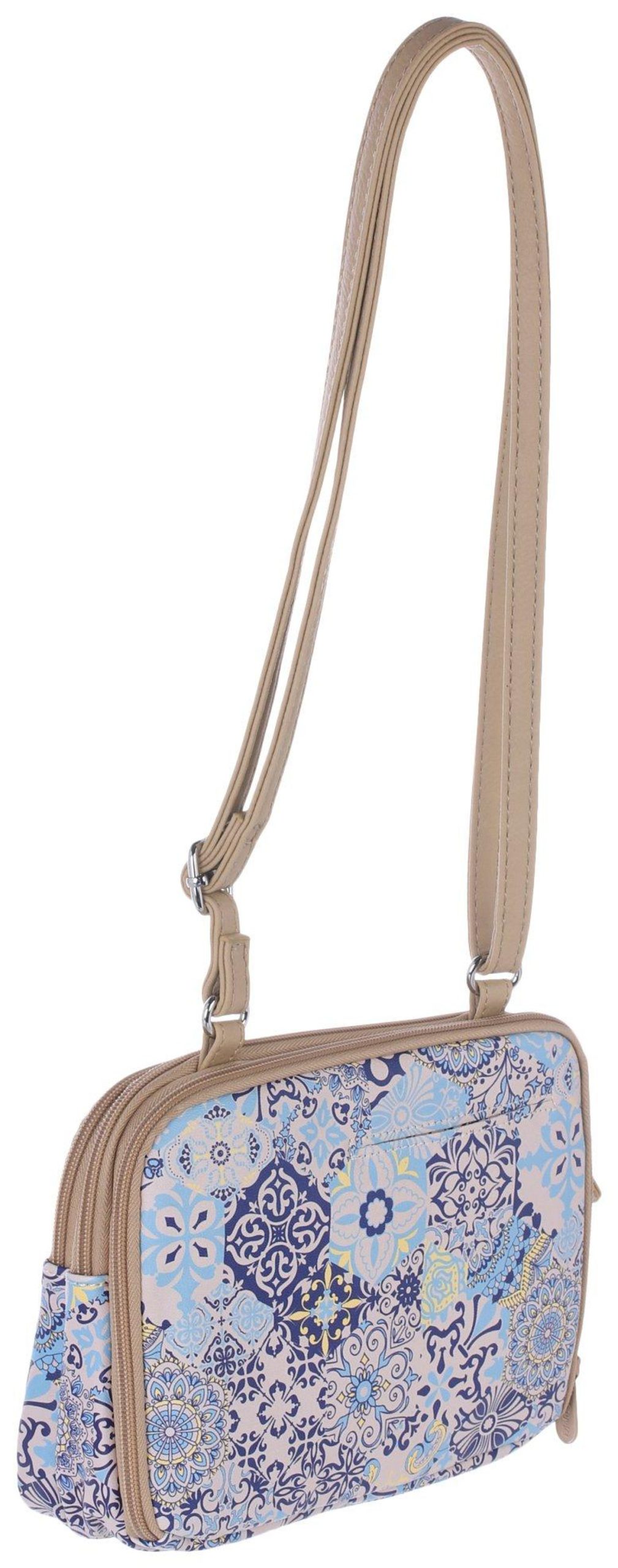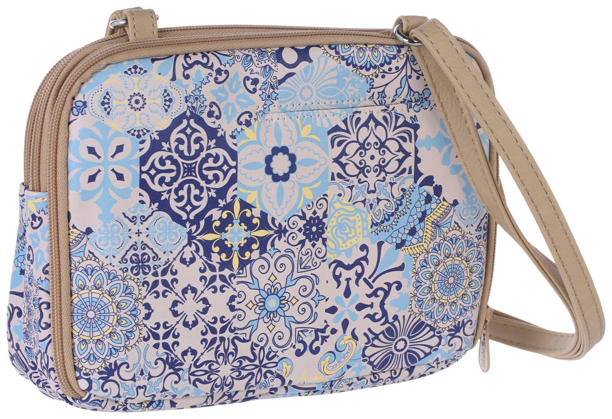 The Zippy crossbody handbag features an adjustable crossbody strap, a front flap pocket, two zipper pockets, one rear slip pocket, two main zip compartments, and one zip-around compartment. The rear compartment contains one zipper divider pocket, and six credit card slots. Measures approximately 9.5 in x 3 in x 7 in.