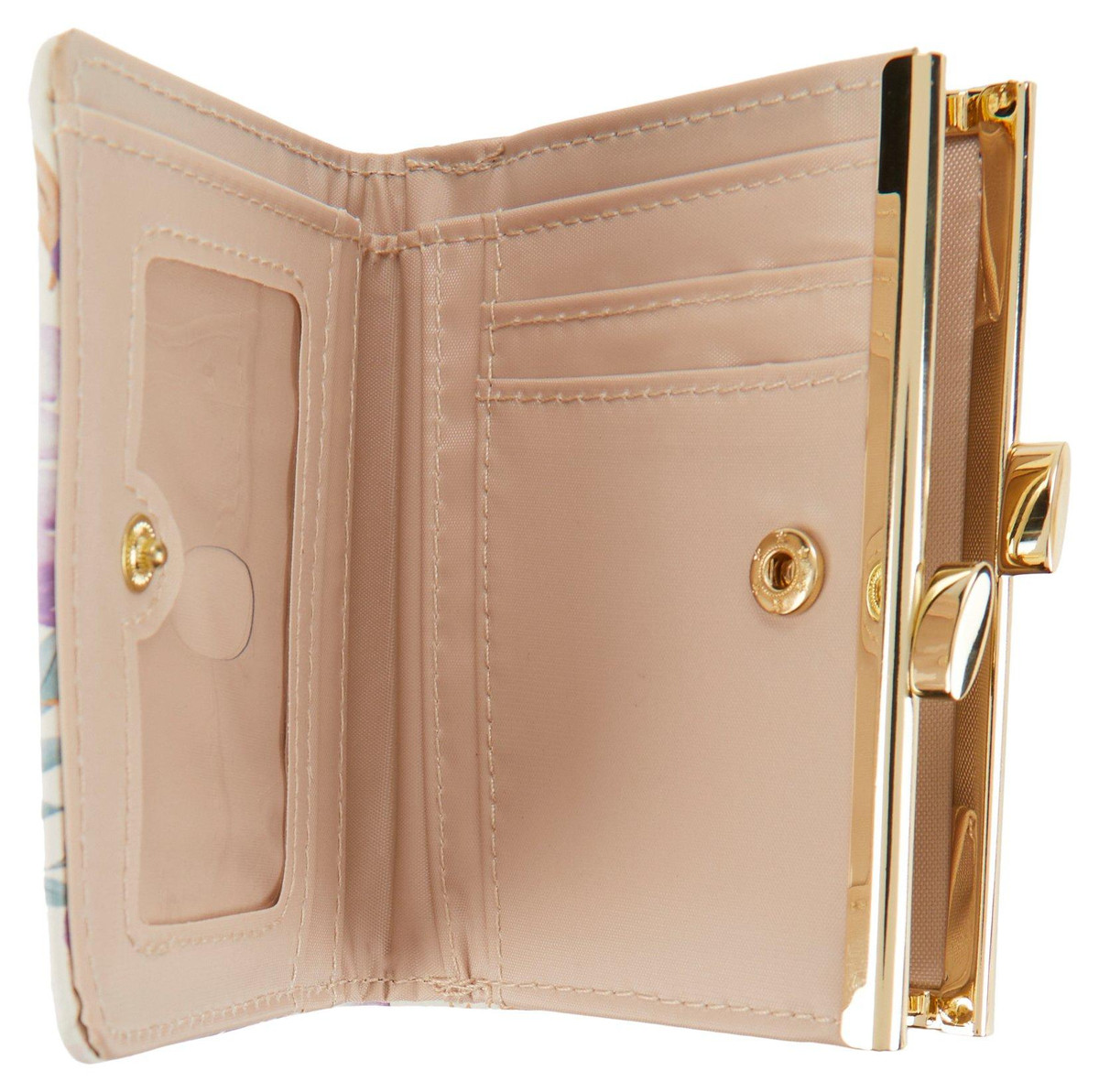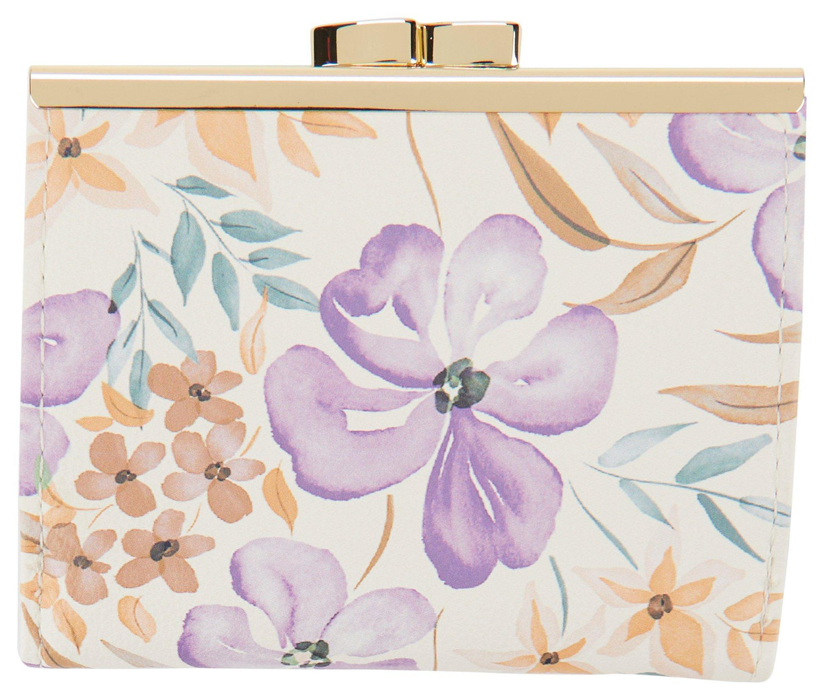Frenchie bifold wallet has the look of a clutch built with the security of RFID-blocking technology for protection. It’s crafted from smooth faux leather and features a silver-tone kiss top lock pocket for your coins and receipts. Plus, it has an ID window and multiple slip pockets to organize your cards and a snap-button closure for added safety. Measures 4 in. x 3.5 in.