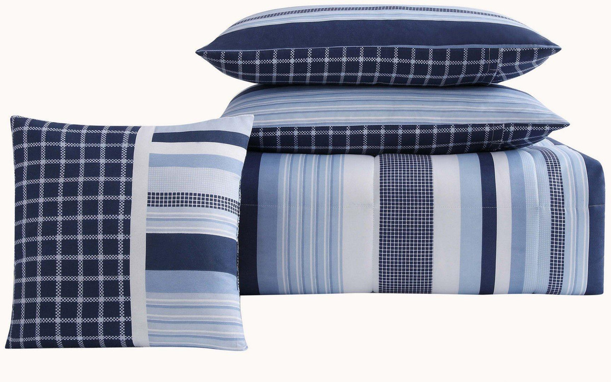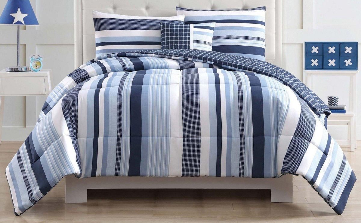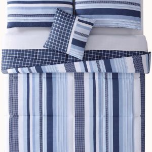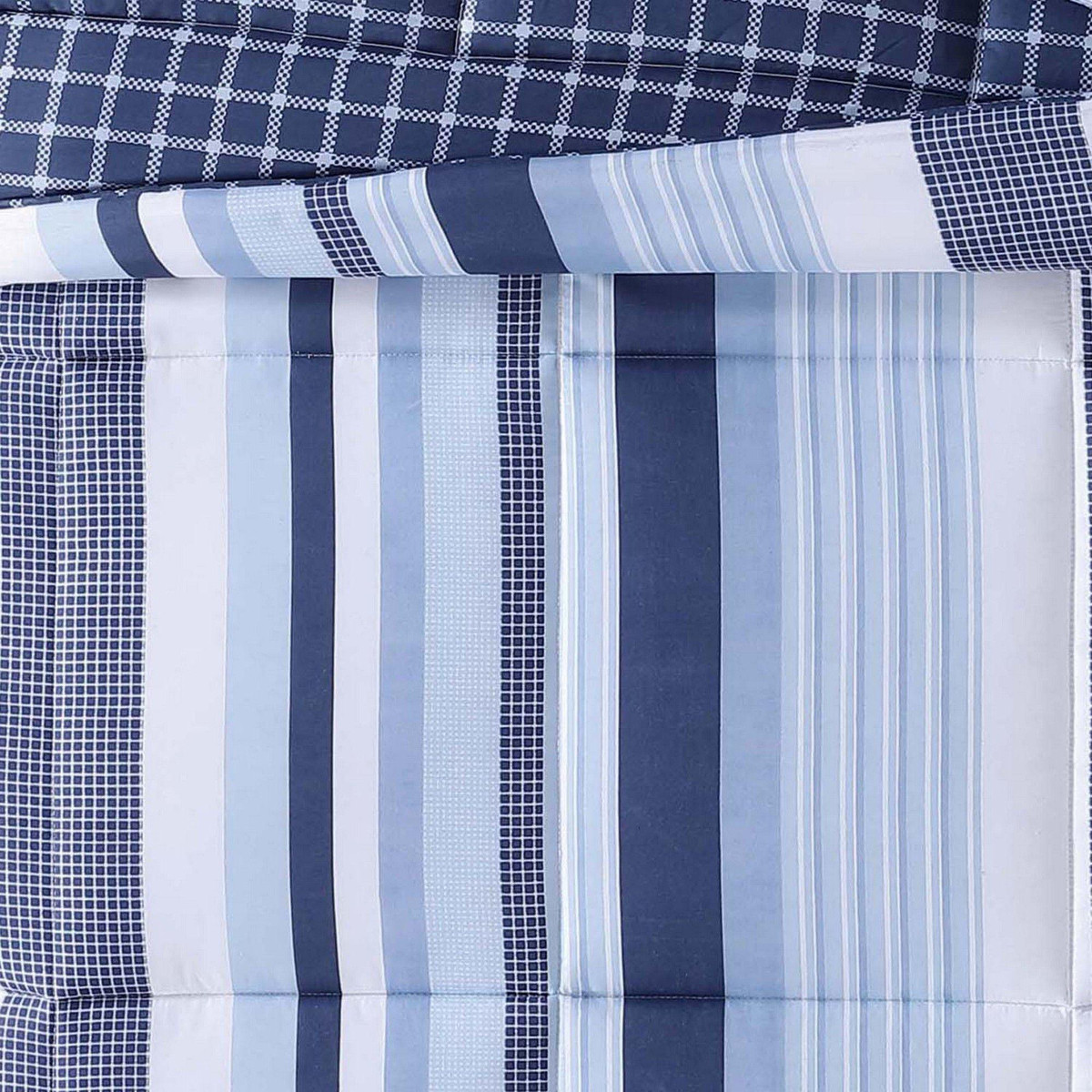 Mason Stripe Comforter features a classic stripe print with plaid textures in blues and whites for a nautical theme. Reverse is blue grid print in same microfiber fabric. Set includes one comforter and two pillow shams (one twin), & 16” x 16” decorative pillow.
