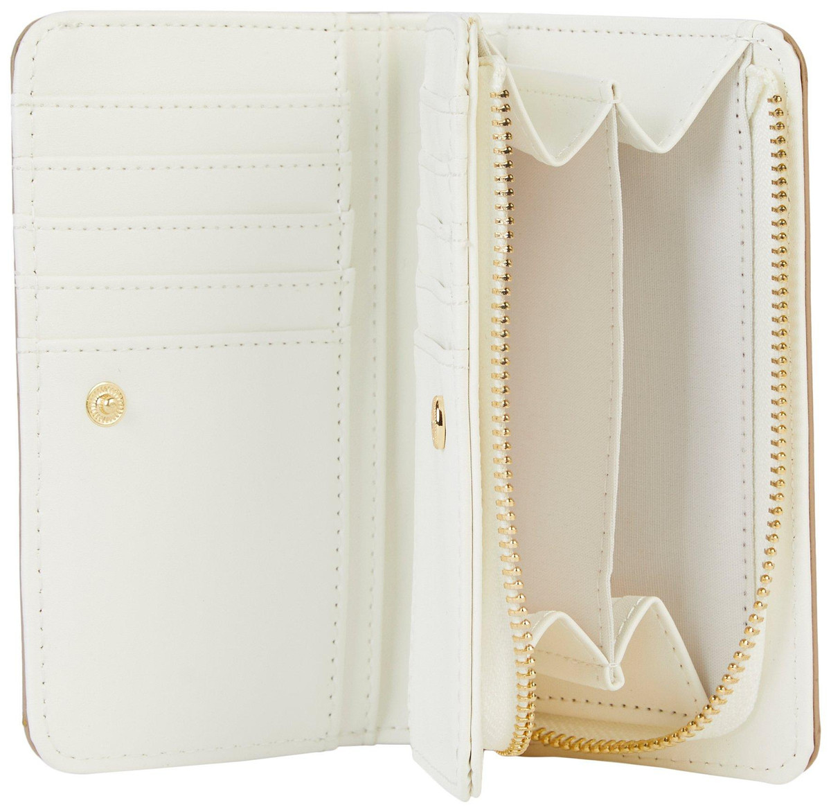 This wallet features a floral print design, brand logo hardware accent, stitch trim, dual compartments. Measures 5.75 in x 3.5 in.