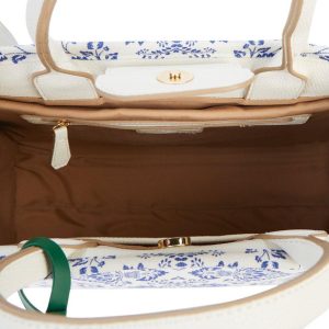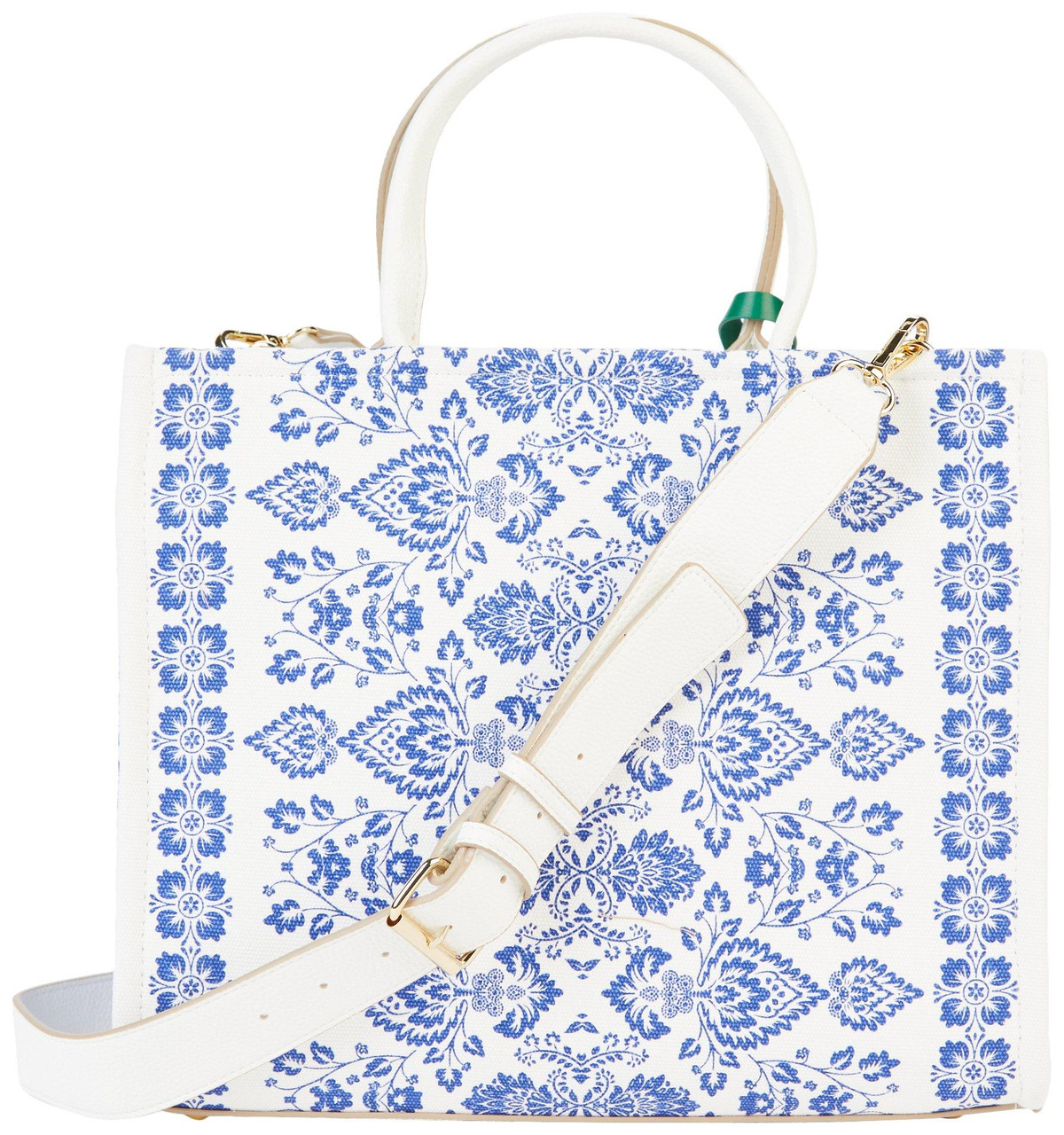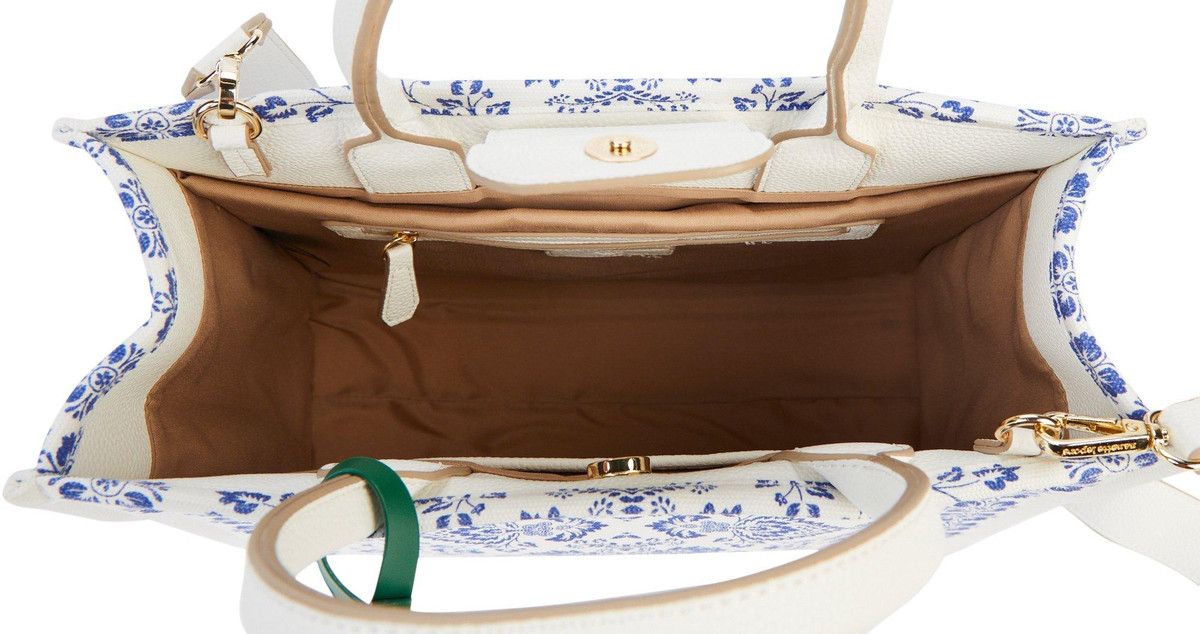The Elle Blue Floral Satchel blends charm and function with its elegant floral print, faux leather-wrapped handles, gold-tone hardware, and removable crossbody strap. A playful orange fruit charm and snap button closure add the perfect finishing touches. Measures 13 x 5 x 11 in.