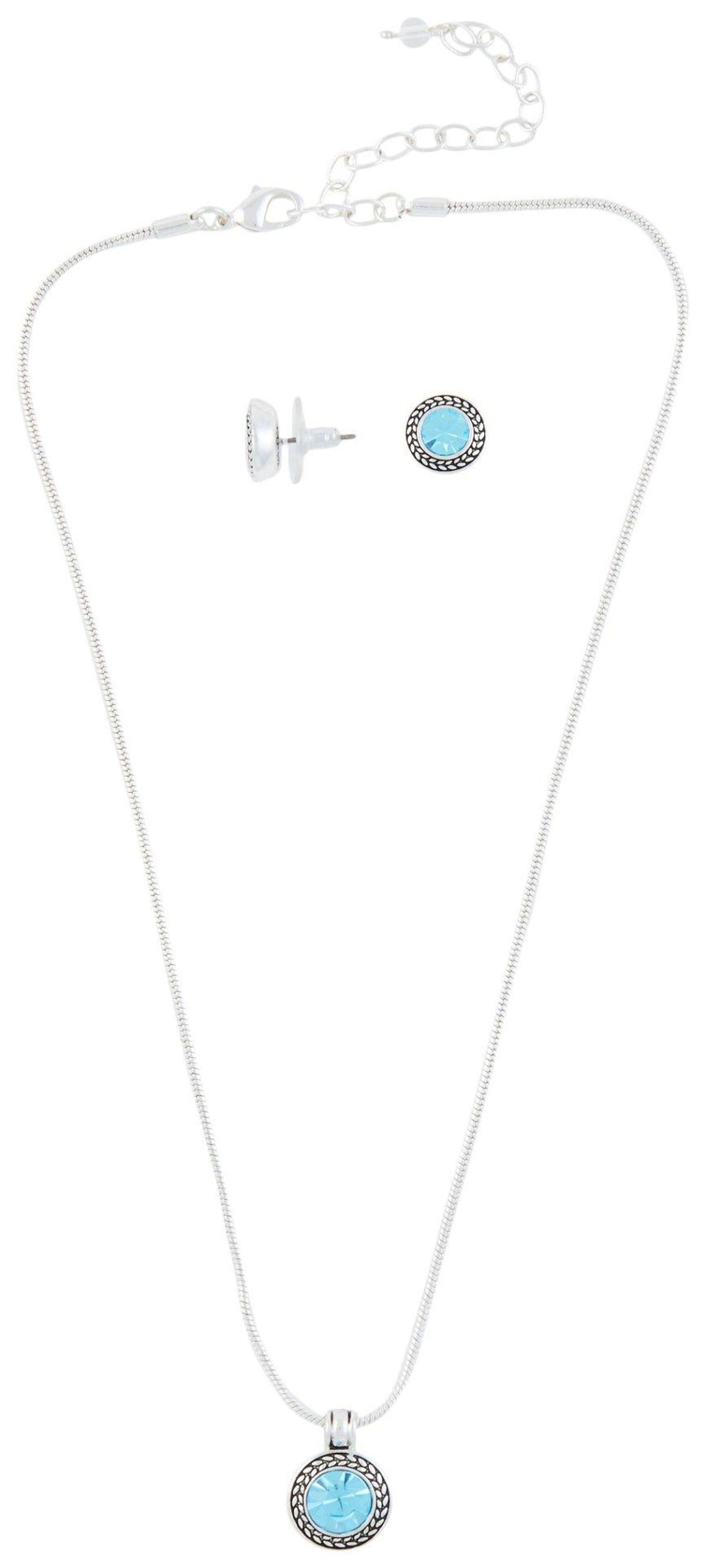 The 16-inch Pendant Necklace & Earrings Set features a stunning silver-tone necklace with a vibrant turquoise pendant, paired with matching stud earrings for a coordinated look. This elegant set adds a pop of color and sophistication to any outfit, perfect for both casual and formal occasions..