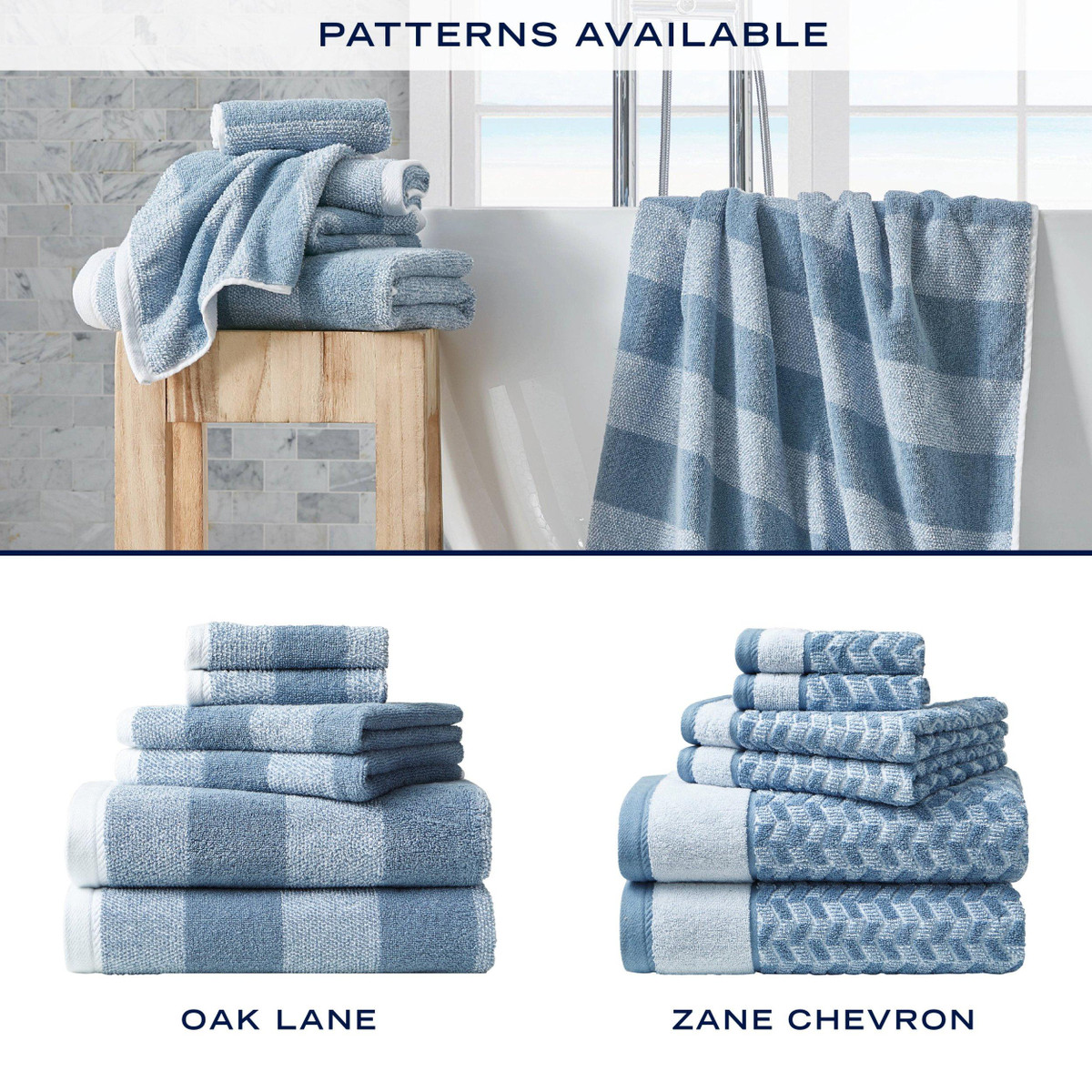 The Nautica Oak Lake Towel Set is a luxurious 6-piece collection that combines style and comfort. Crafted from 100% cotton yarn dye terry, they feature mingled yarns to create a sense of dimension. Soft and medium weight, they offer a fluffy, soft feel with durable fibers for long-lasting use. Oeko Tex Certified, this set ensures environmental safety while elevating your bathroom. Includes 2 bath towels (54 in. x 28 in.), 2 hand towels (28 in. x 16 in.) and 2 washcloths (13 in. x 13 in.).