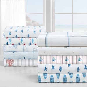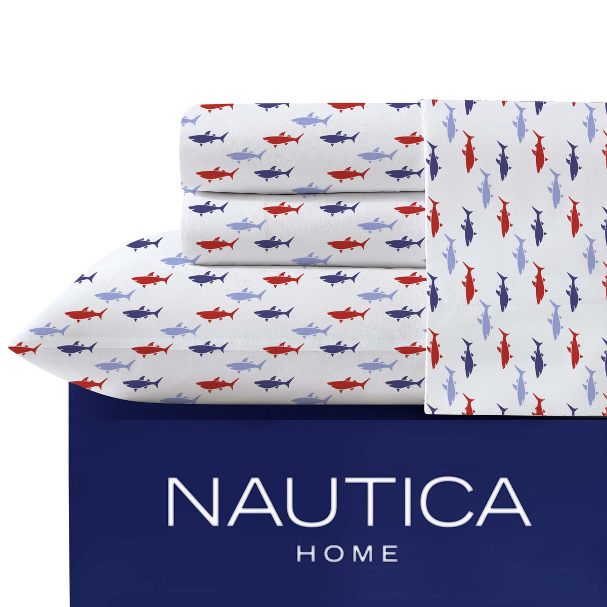 Add a splash of ocean fun to your bedroom with the Nautica Costazul Shark Sheet Set. Featuring a playful red and blue shark print, these 200 thread count cotton percale sheets are breathable, lightweight, and cool to the touch. The fully elasticized fitted sheet stays snug on your mattress, while the durable cotton construction ensures long-lasting comfort. Machine washable for easy care, this novelty set brings both style and function to your sleep space.