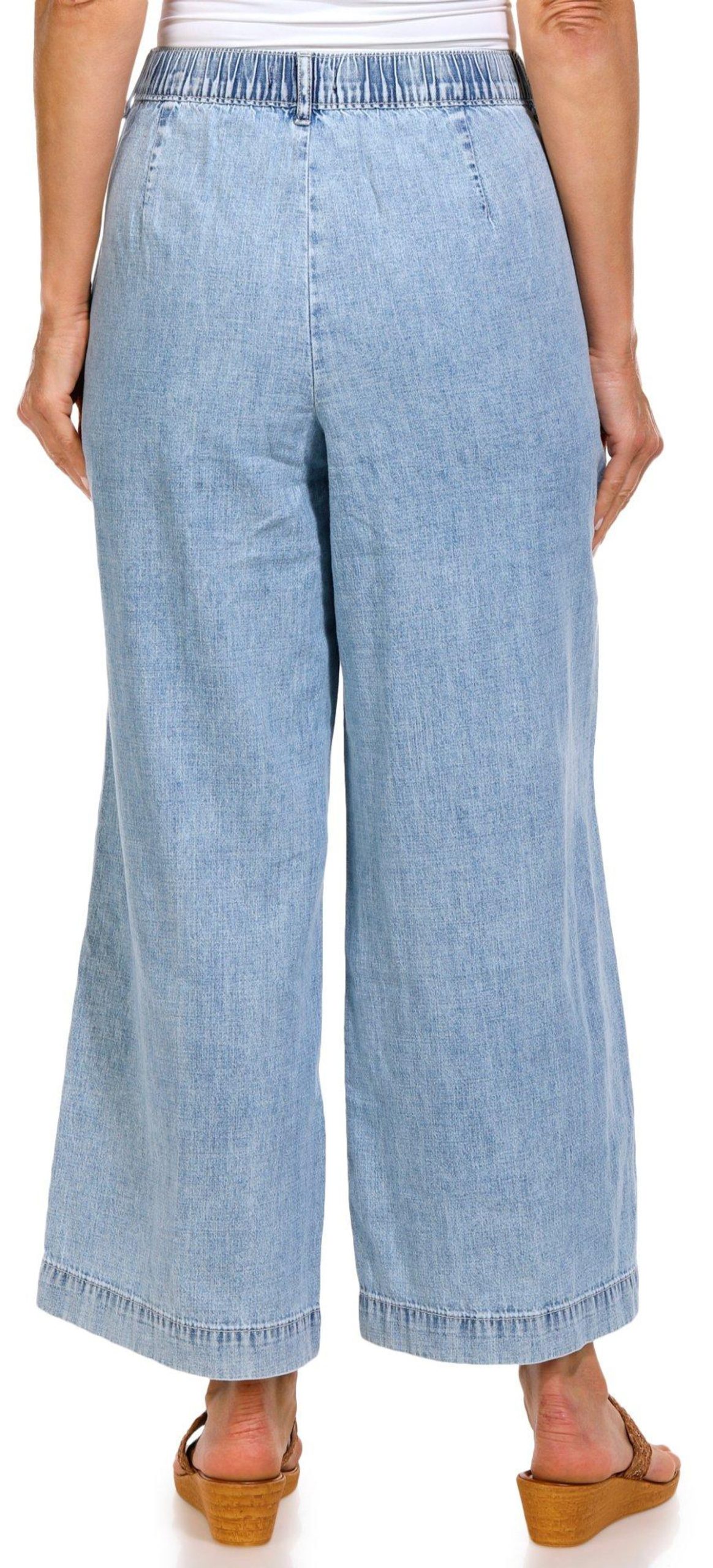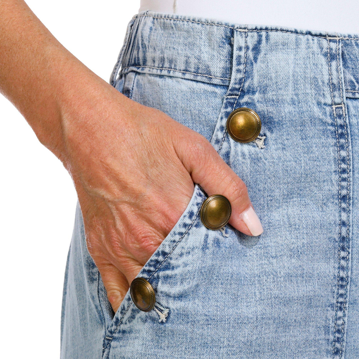 Perfect for a day at sea or on land, our Womens Sailor Jeans made of 100% cotton feature gold-tone buttons at the front, side pockets, a trendy wide leg fit, elastic waistband and a button-fly zip closure. Inseam measures 27 inches.