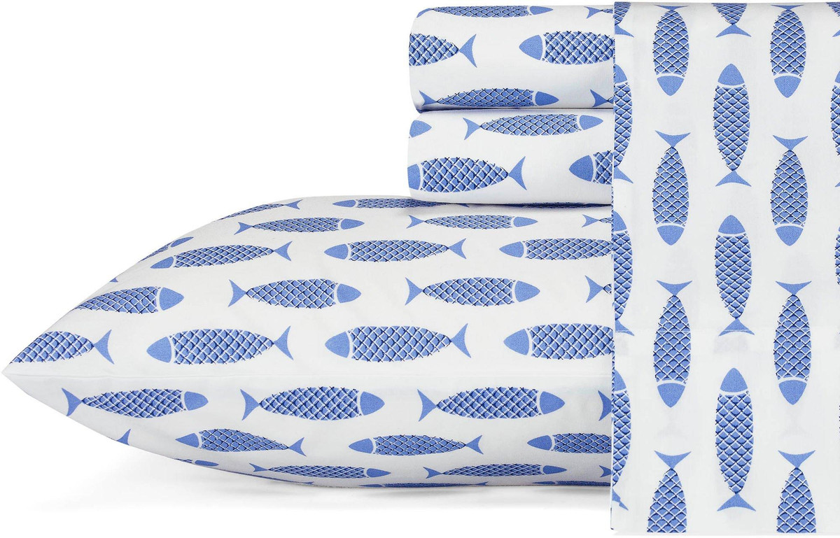 Add a touch of whimsy to your bedding ensemble with the Nautica Woodblock Fish Sheet Set. The sheets and coordinating pillowcases feature a decorative woodblock fish motif in fresh blues against a crisp white ground. This cotton percale sheeting truly inspires coastal living. Includes fitted sheet, flat sheet, and two pillowcases (one pillowcase for twin).