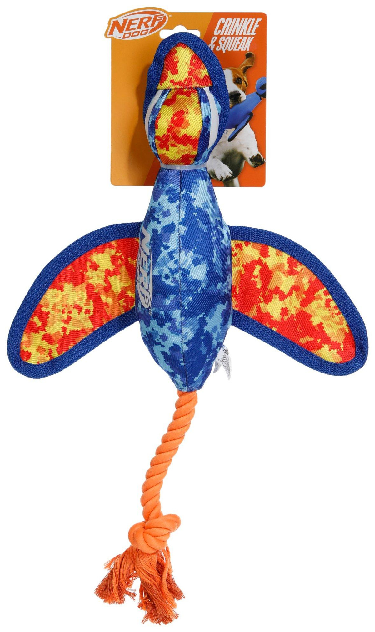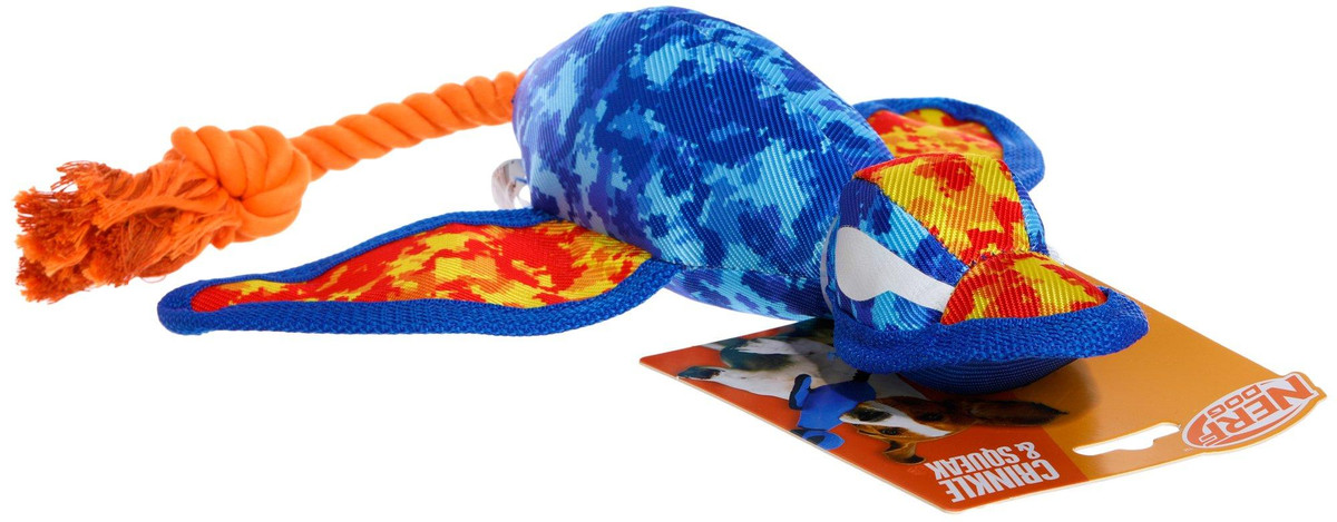 Designed for tough play, this orange and blue duck features durable nylon construction, crinkly wings for added excitement, and a digital camo print. Great for fetch and tugno launcher needed!