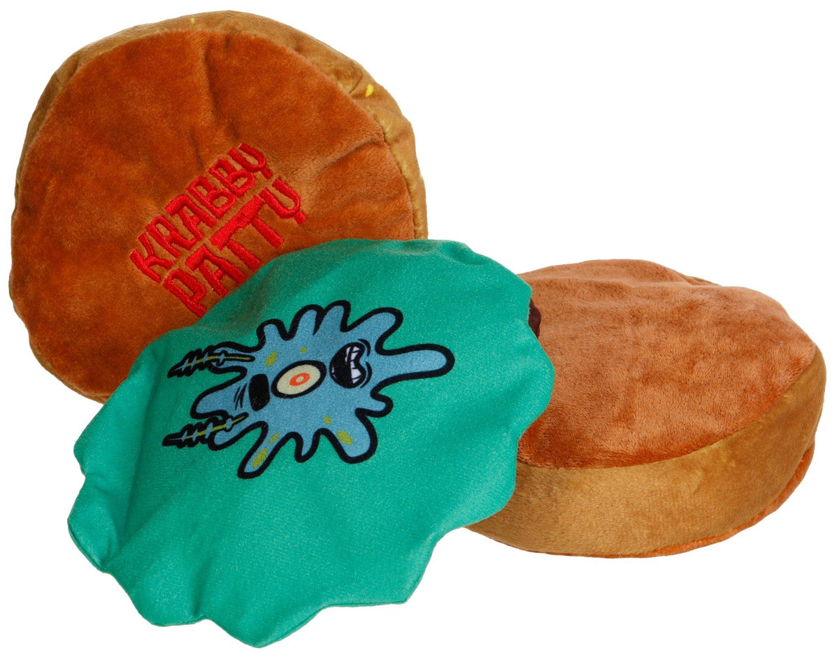 The SpongeBob Krabby Patty squeaky plush dog toy is a fun tribute to the iconic burger from Bikini Bottom. Shaped like a Krabby Patty and made from soft plush fabric, it features crinkle lettuce and a built-in squeaker to keep your pup entertained2. Designed for light to medium chewers, this officially licensed Nickelodeon toy is perfect for dogs who love playful textures and nostalgic flair.