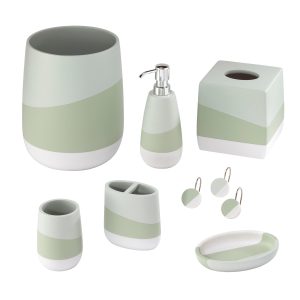 Elevate your bathroom decor the Nicole Miller 2-piece Tropiluxe Decorative Accessory Set. It features a modern, sleek, smooth-to-the-touch design with irregular bands of light green and celadon green with a white base. Made of durable resin for easy-care and long life. The set includes a toothbrush holder (4.20 x 2.20 x 4.30) and a lotion dispenser (2.80 x 2.80 x 8.36).