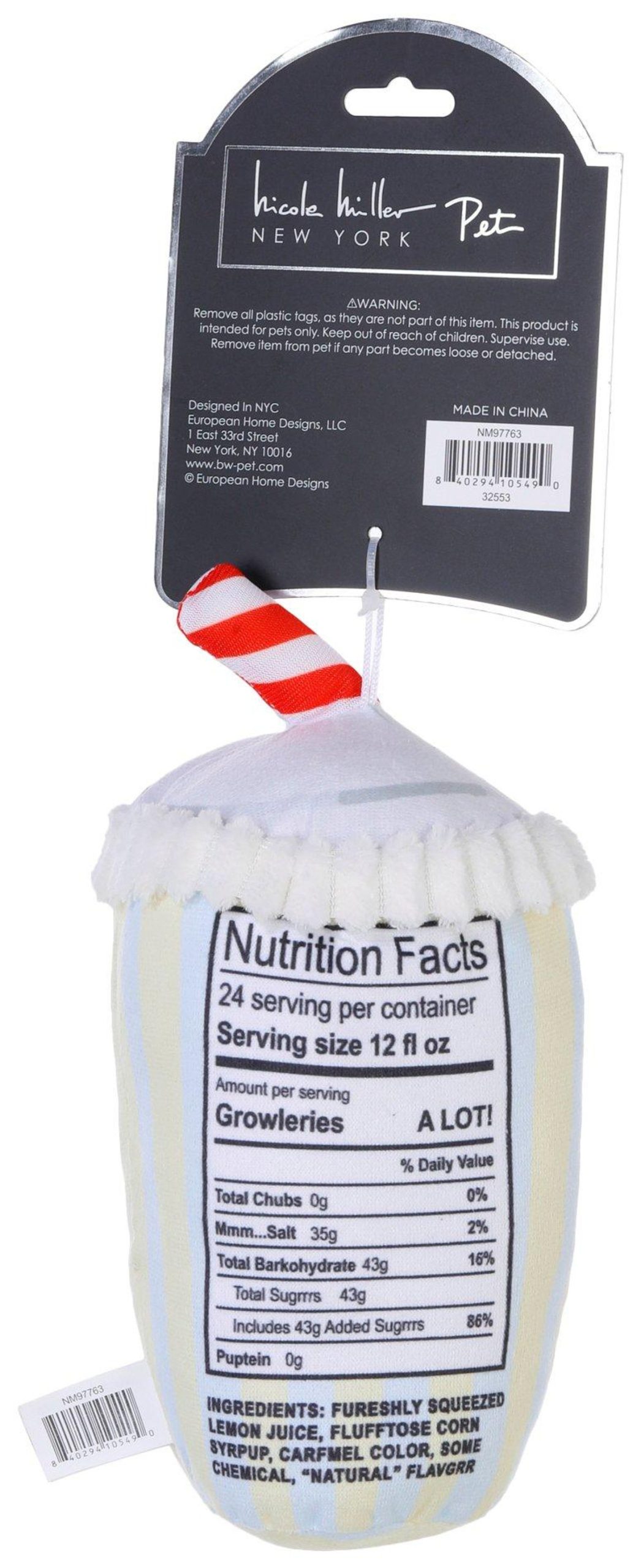 Add a splash of summer fun with this Lemonade plush dog toy, styled like a refreshing to-go cup with bright colors and soft fabric. Built-in squeaker keeps pups entertained while the plush texture makes it perfect for light chewing and cuddling. Great for indoor play or lounging with your furry friend. Measures approximately 9 in.