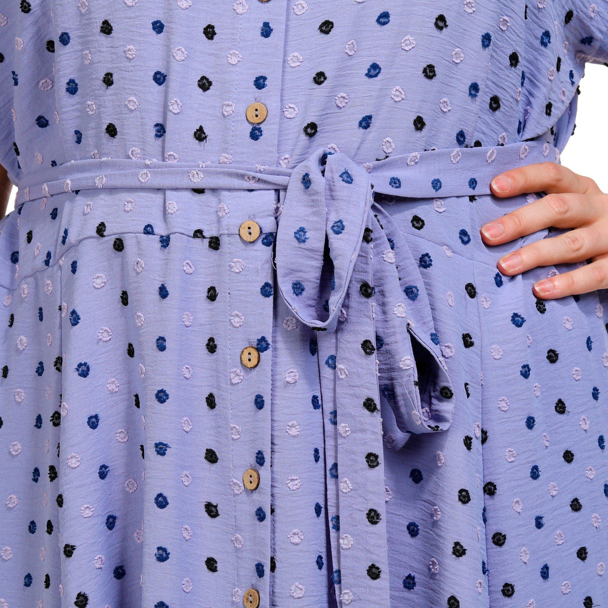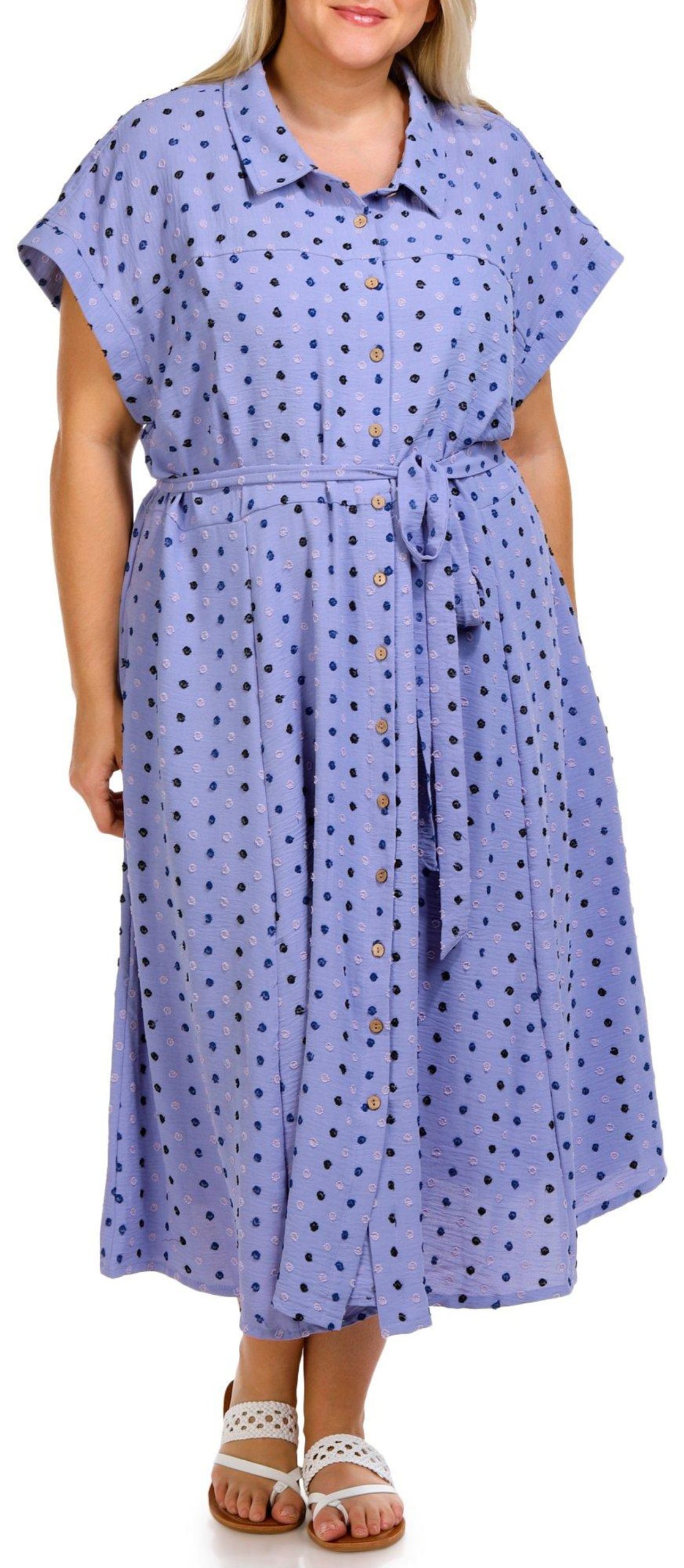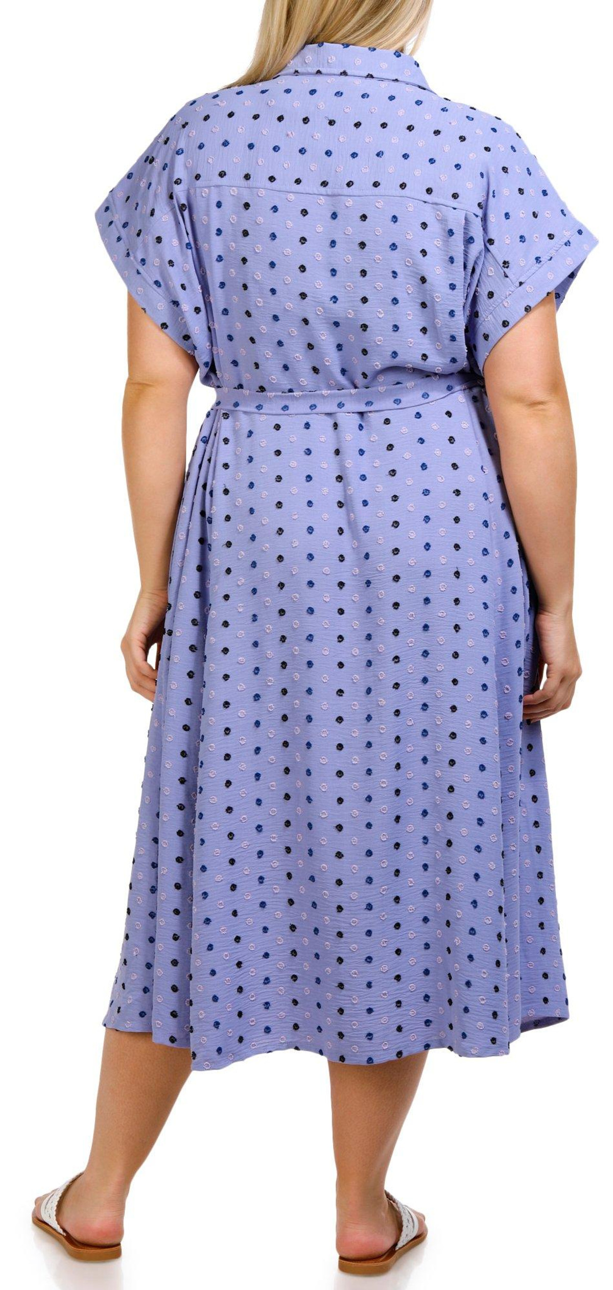 Step out in effortless style with this Short Sleeve Midi Shirt Dress. Featuring a flattering waist tie and a classic buttoned front, this dress is designed to enhance your silhouette. The embroidered polka dot pattern adds a touch of playful elegance, while the side slip pockets provide both convenience and charm. Perfect for any occasion, this versatile dress combines comfort and sophistication. Fabrication is 95% polyester, 5% spandex.