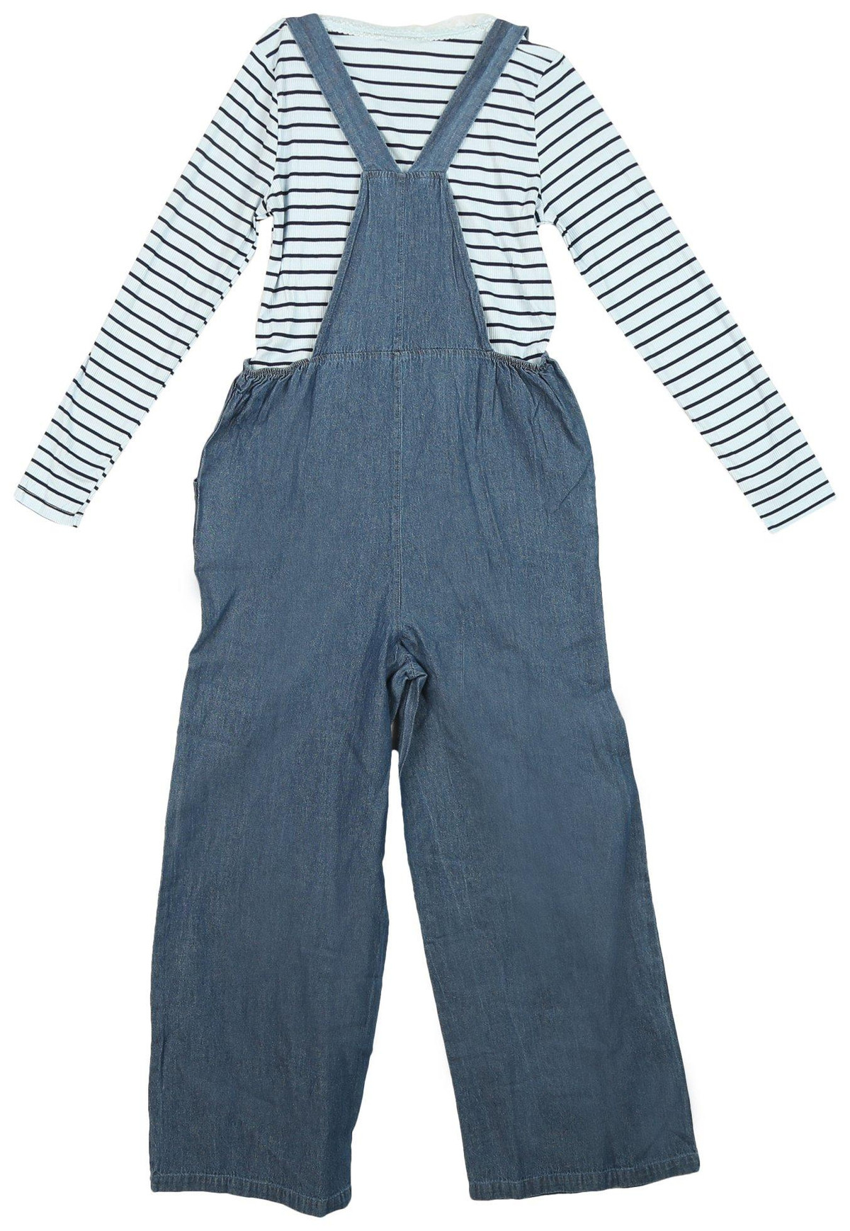 Get ready for any occasion in this cute 2-piece set! It includes a pair of stylish denim overalls and a striped long sleeve shirt, adorned with lace details.
