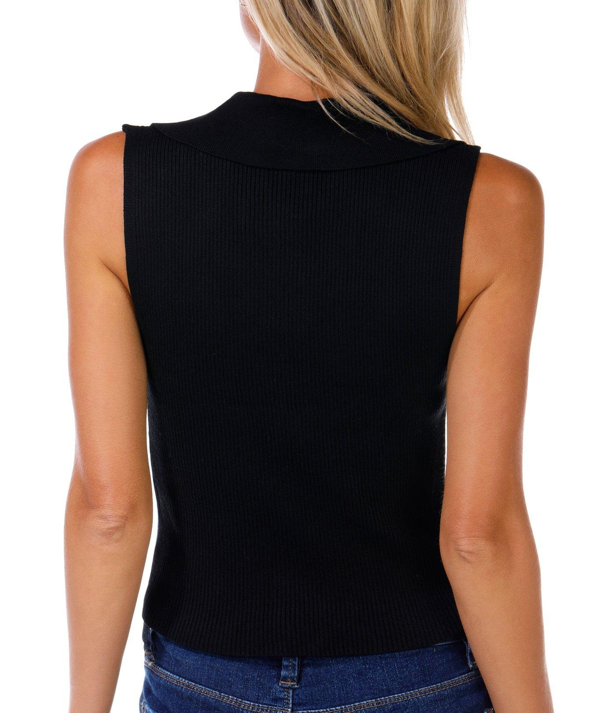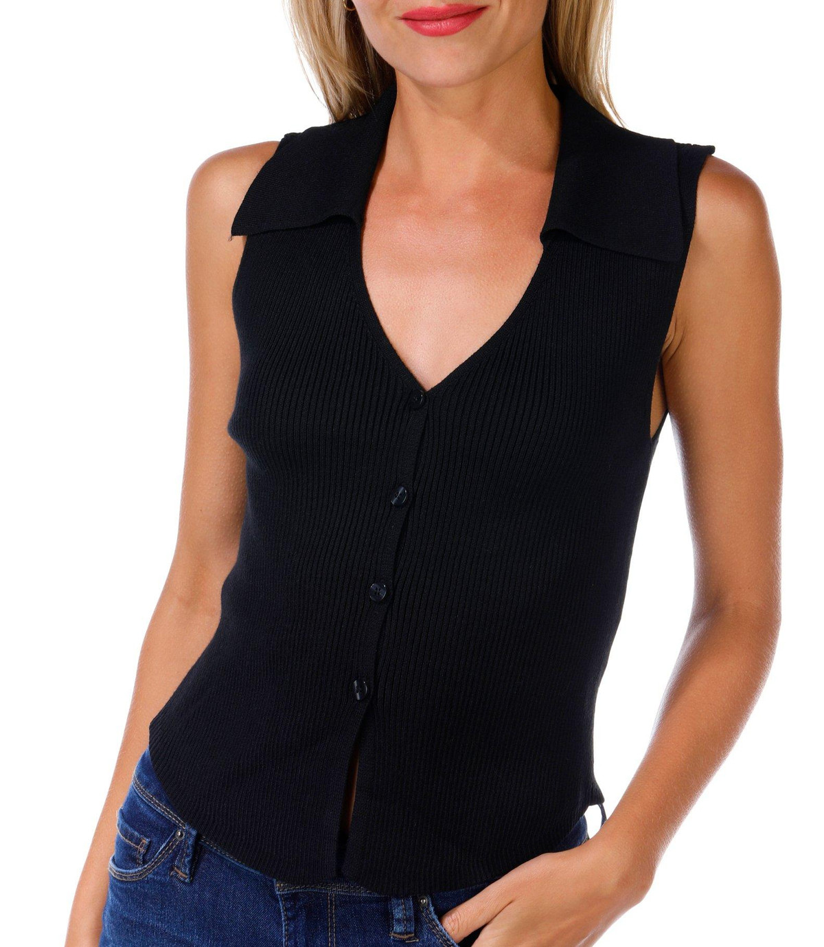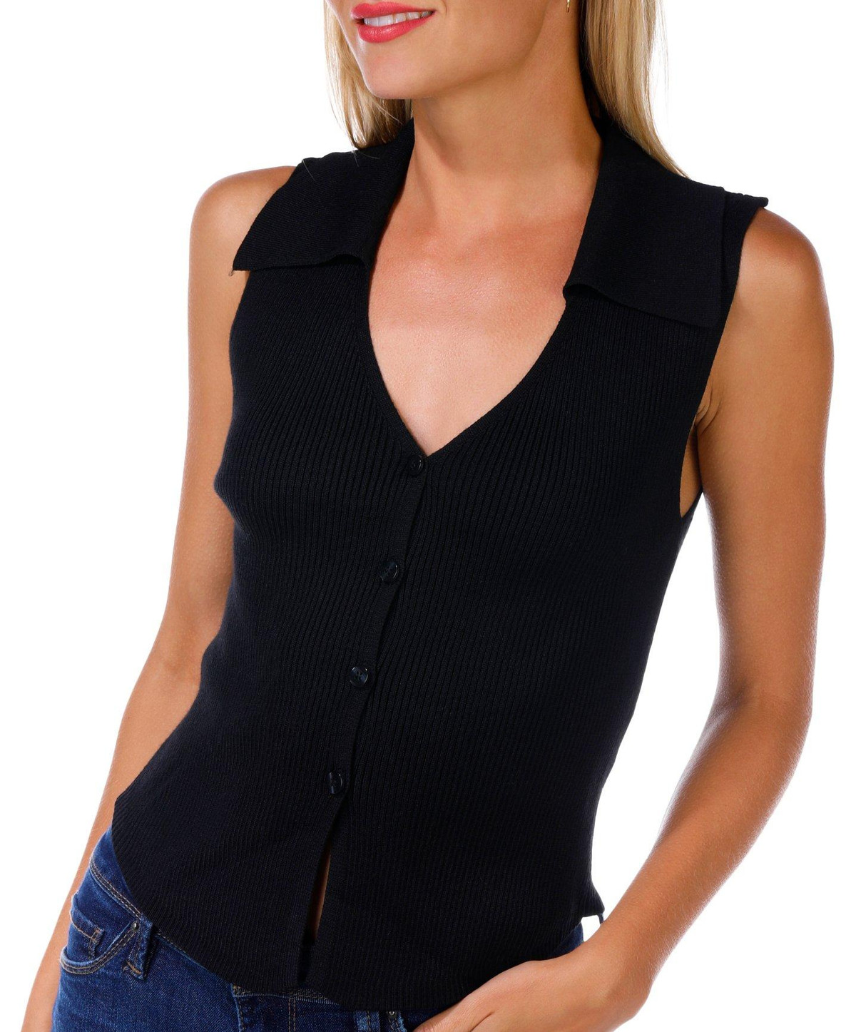 This juniors top features a solid ribbed texture with a button down front and a sleek johnny collar. The sleeveless design adds a modern touch, making it a versatile piece for layering or wearing on its own. Fabrication 80% rayon, 20% polyester