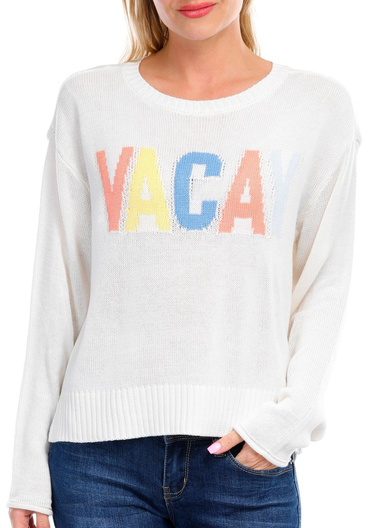 Introducing the Juniors Vacay Sweater, made from 100% acrylic for a soft and cozy feel. This trendy sweater features a classic round neckline and a playful Vacay script on the chest, adding a fun and relaxed vibe to your outfit. Perfect for casual outings or lounging at home, this sweater combines comfort and style effortlessly.
