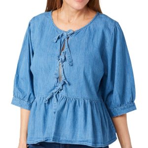 Nouveaux Womens 3/4 Sleeve Tie Front Denim Jacket