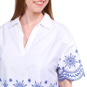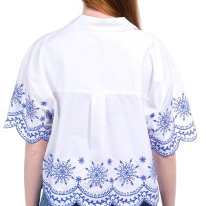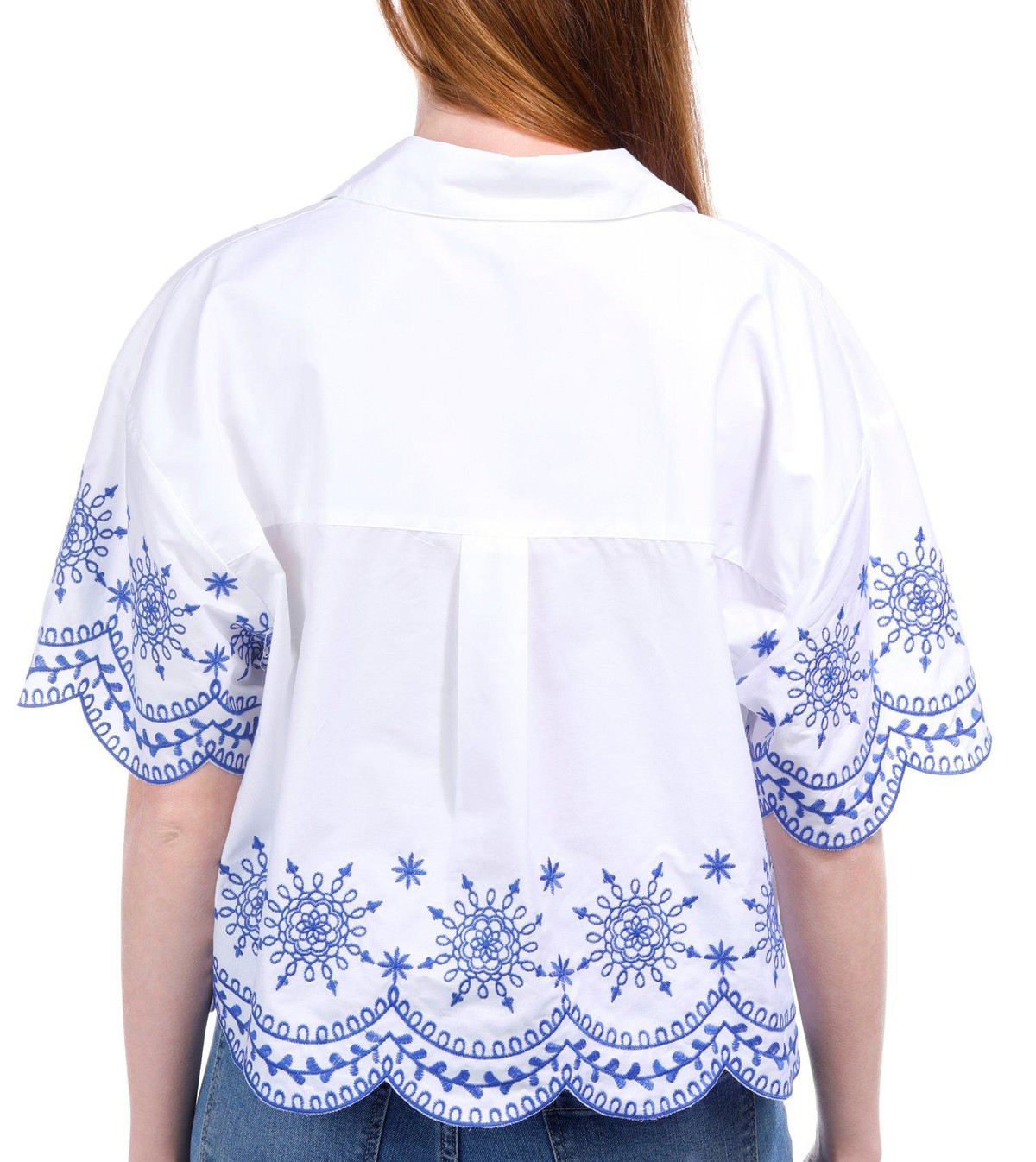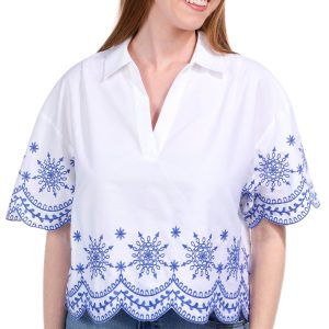 Our Short Sleeve Embroidered Top features a scalloped hem, embroidered design, short sleeves, and a split collared neckline. This lightweight piece adds a touch of charm to any casual outfit, perfect for warm days. Fabrication is 100% cotton.