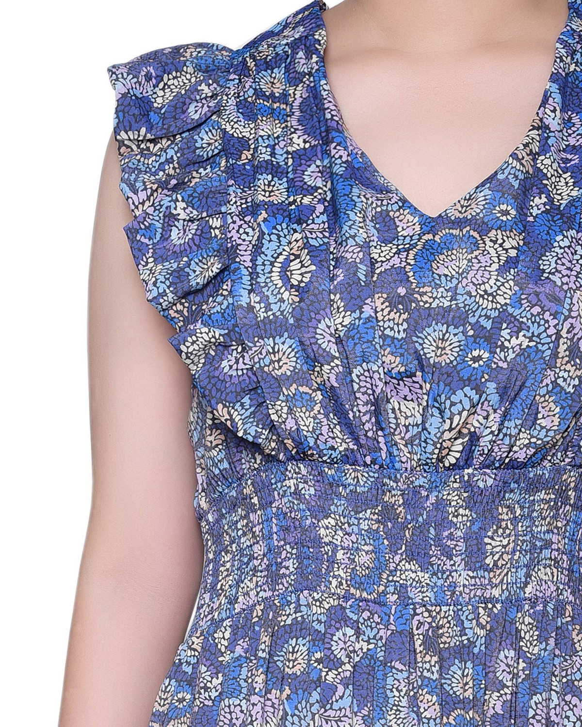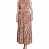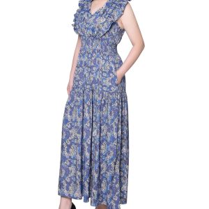 Embrace vintage charm with this sleeveless midi dress, featuring a tiered design and a v-neckline adorned with ruffle details. The shirred smocked waist enhances your silhouette, making it perfect for sunny days or carefree nights. The vintage-inspired floral design adds a touch of nostalgia, ideal for gatherings with friends and family. This dress effortlessly combines elegance and comfort, ensuring you look and feel fabulous on any occasion. Length 50 in. Fabrication 62% rayon, 38% polyester.