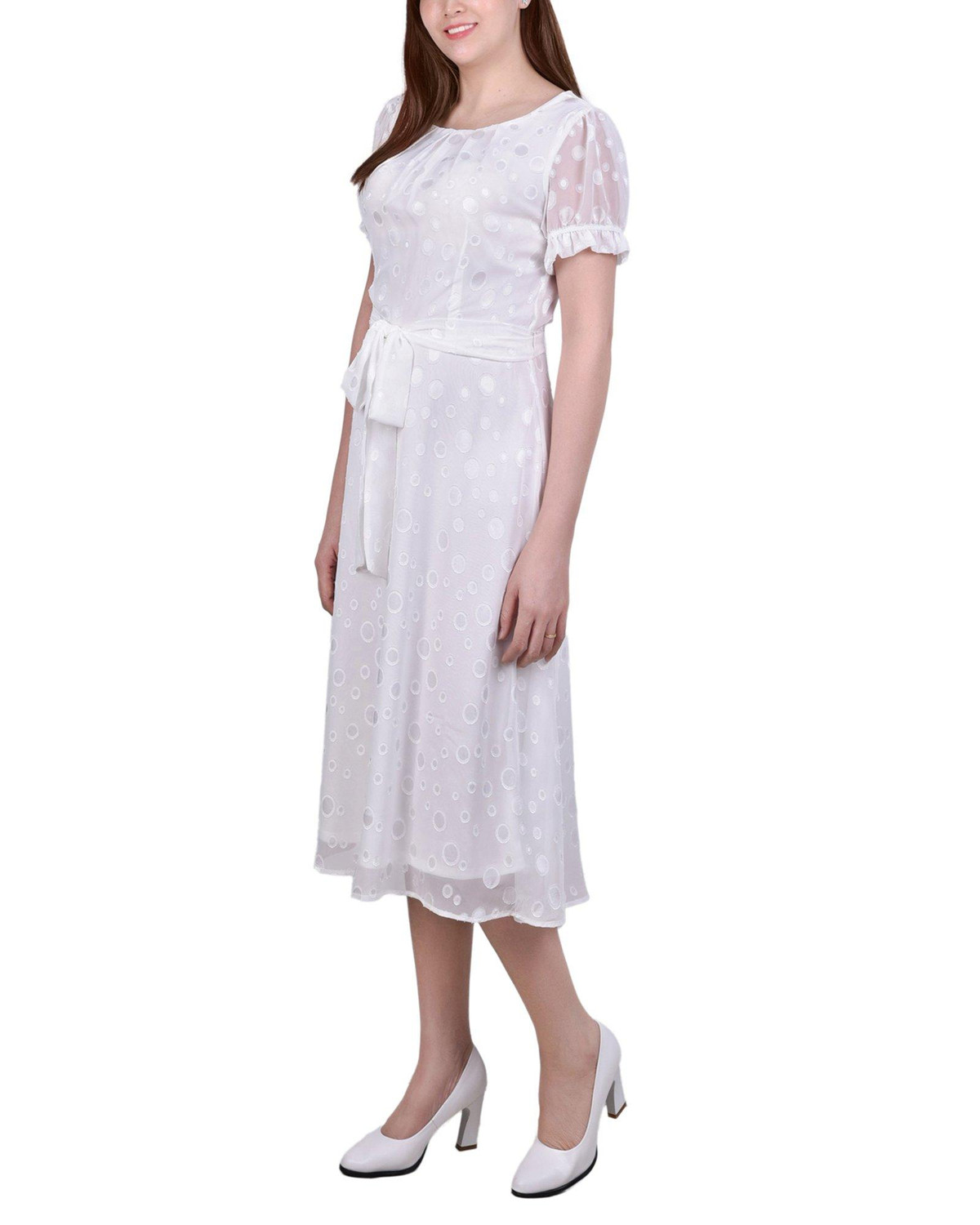 NY Collection presents this sweet and simple swiss dot dress, with a tie waist and ruched sleeves for the perfect special occasion dress.