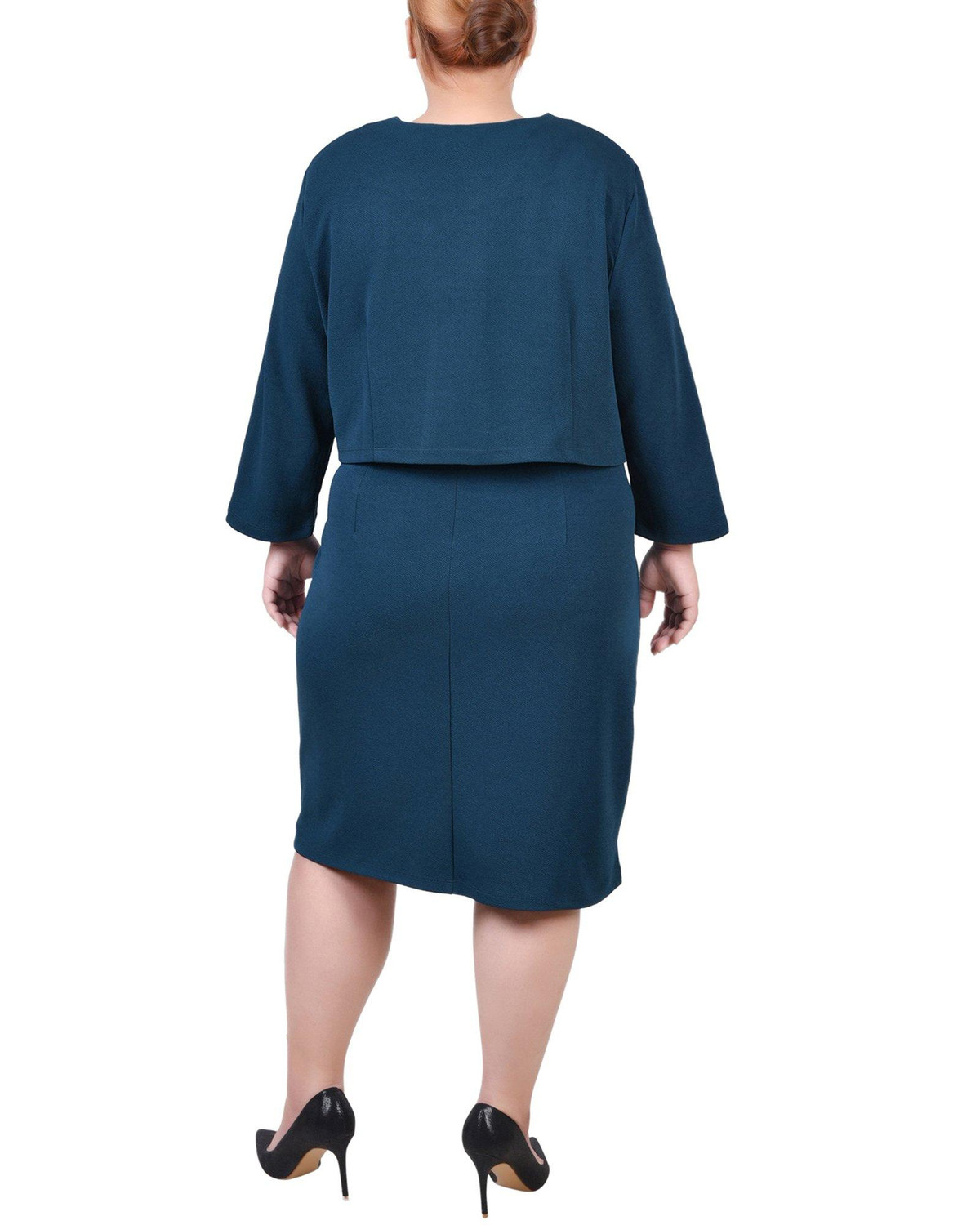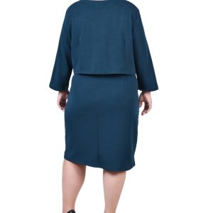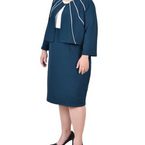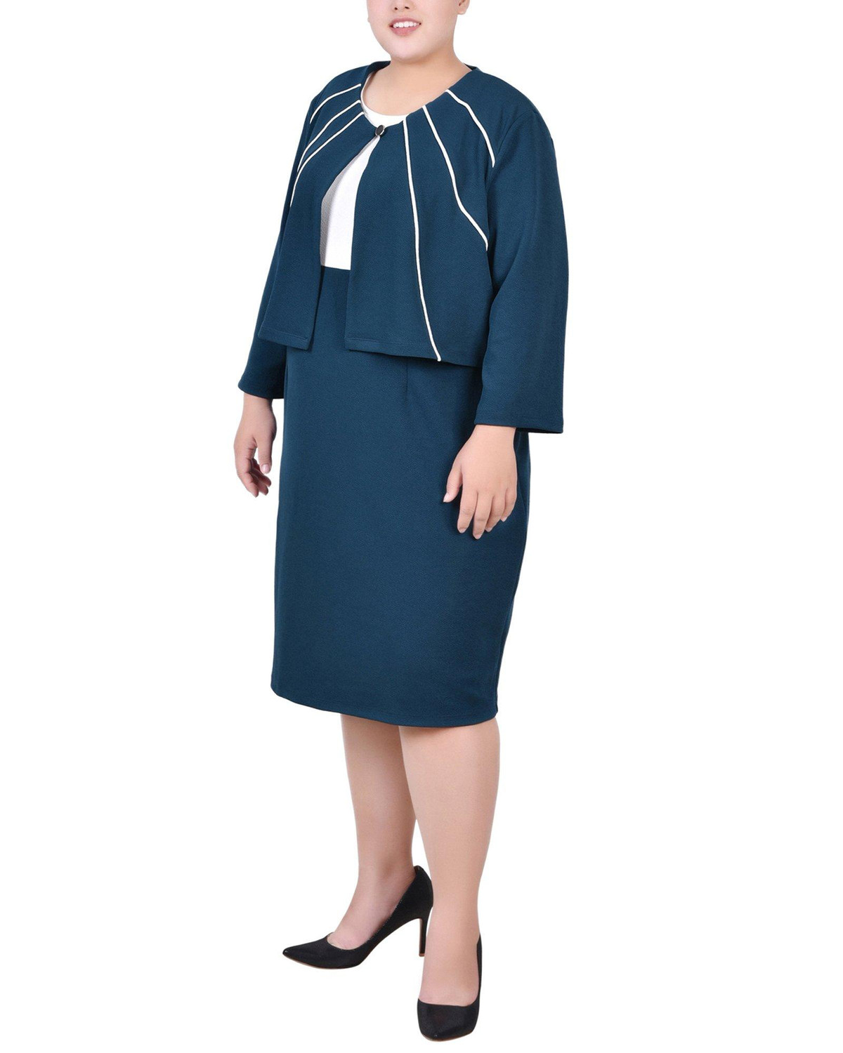 With bold contrast piping details, this NY Collection color-blocked dress is layered under a 3/4 sleeve jacket, perfect for any work day.