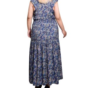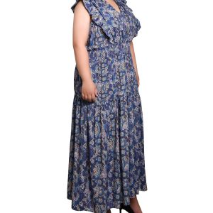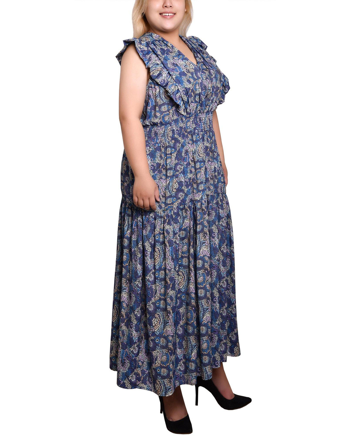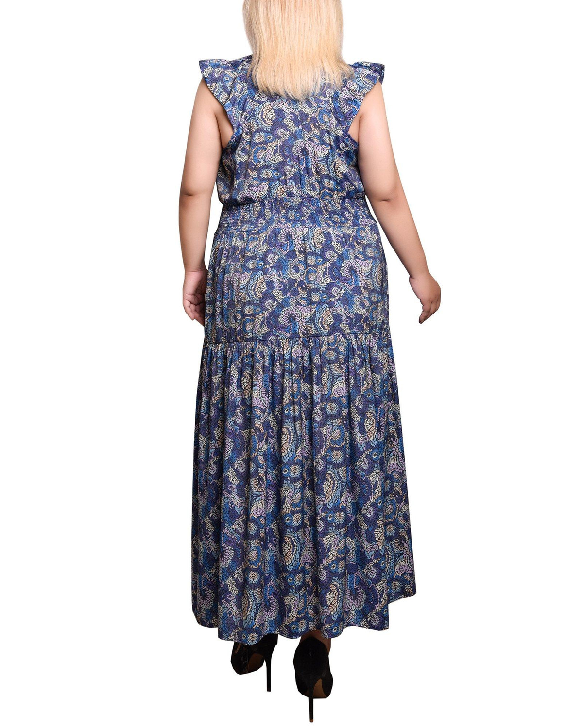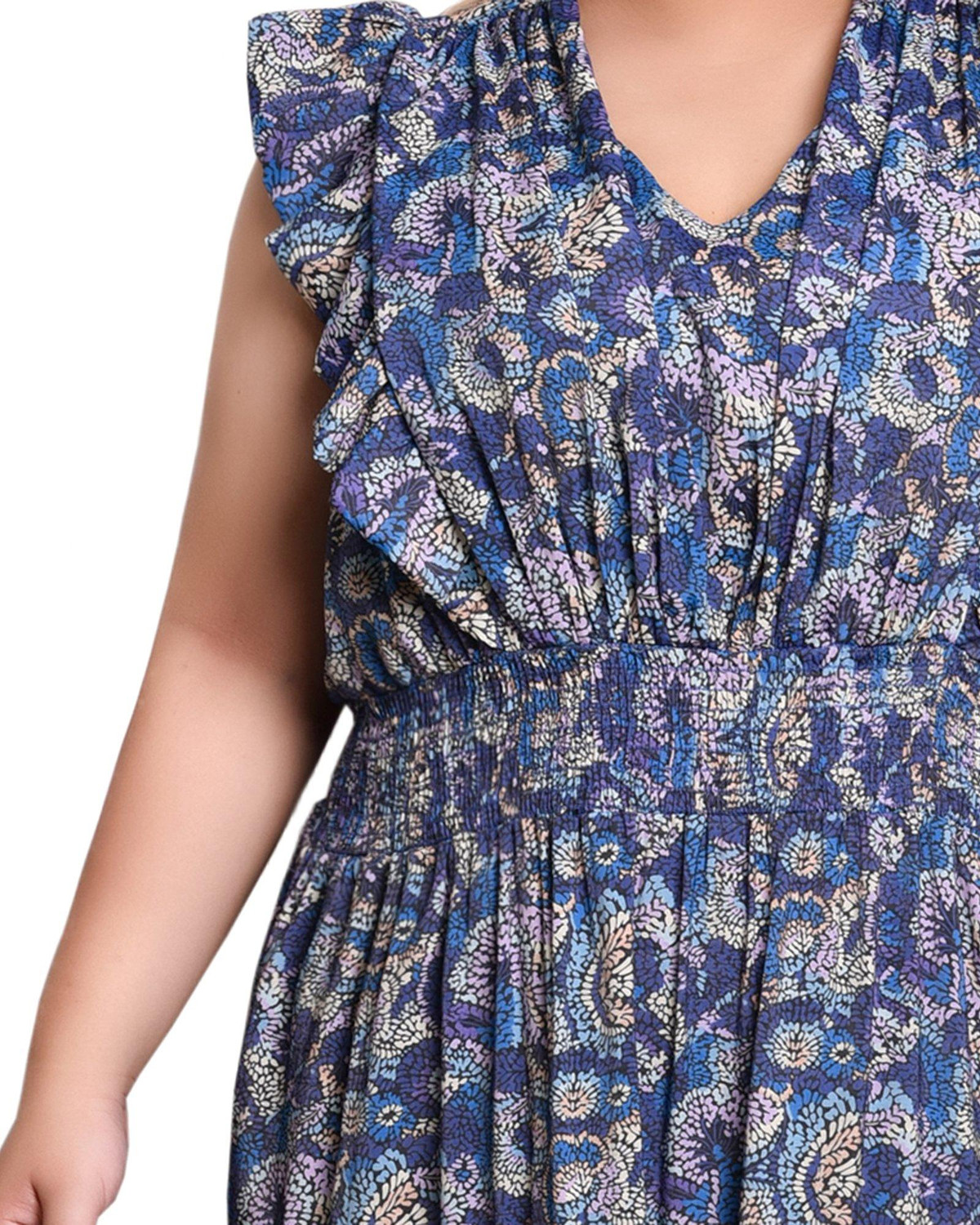 Embrace vintage charm with this sleeveless midi dress, featuring a tiered design and a v-neckline adorned with ruffle details. The shirred smocked waist enhances your silhouette, making it perfect for sunny days or carefree nights. The vintage-inspired floral design adds a touch of nostalgia, ideal for gatherings with friends and family. This dress effortlessly combines elegance and comfort, ensuring you look and feel fabulous on any occasion. Length 46 in. Fabrication 62% rayon, 38% polyester.