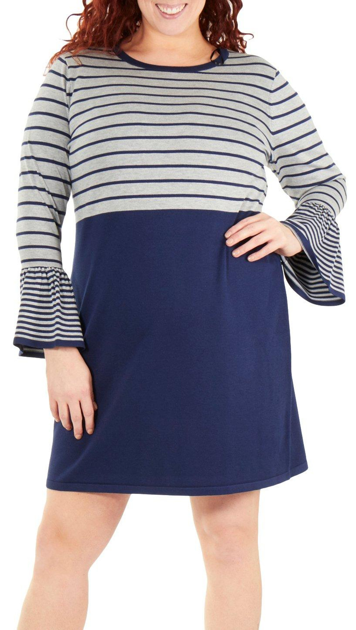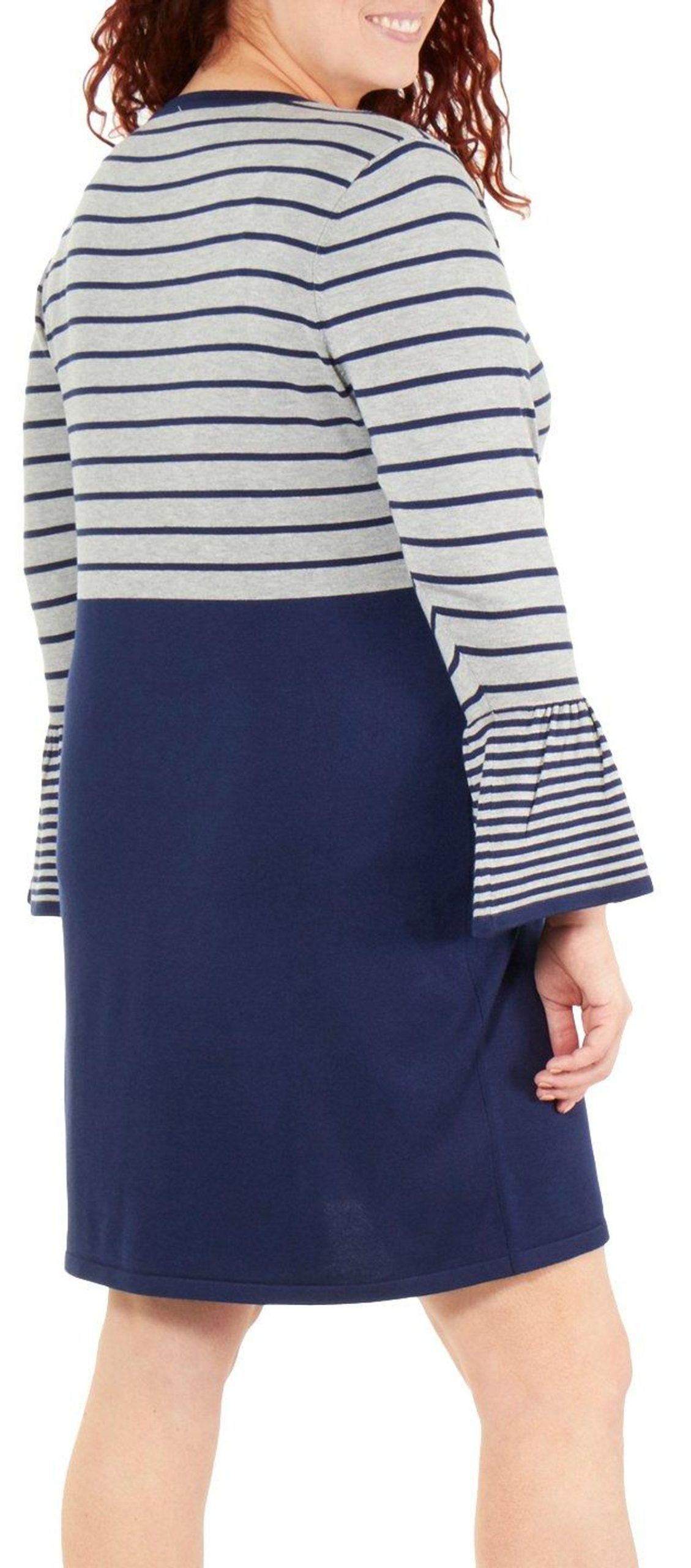 Feautring a striped top and bell sleeves, this stylish colorblocked sweater dress from NY Collection is the perfect go-to winter outfit.