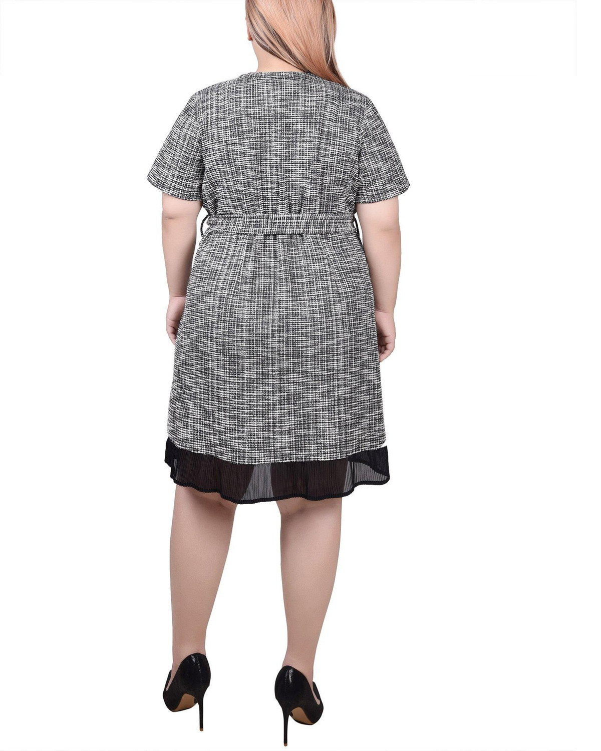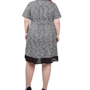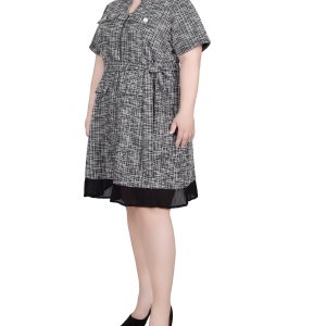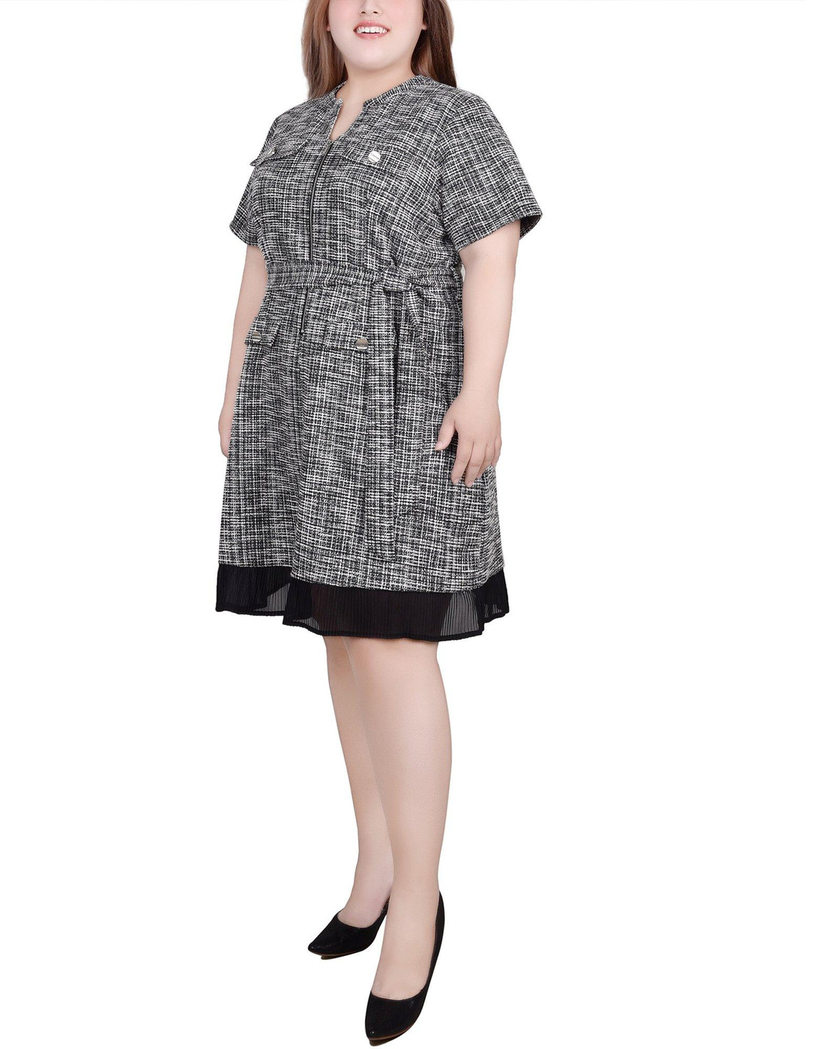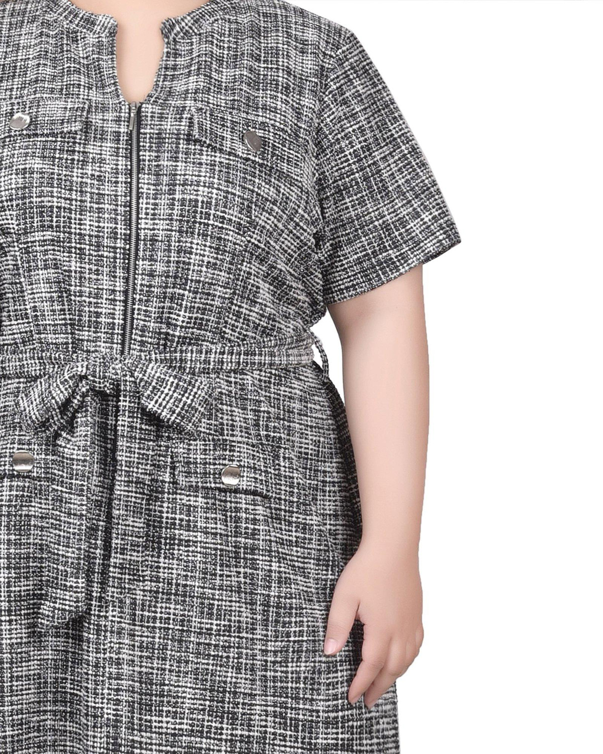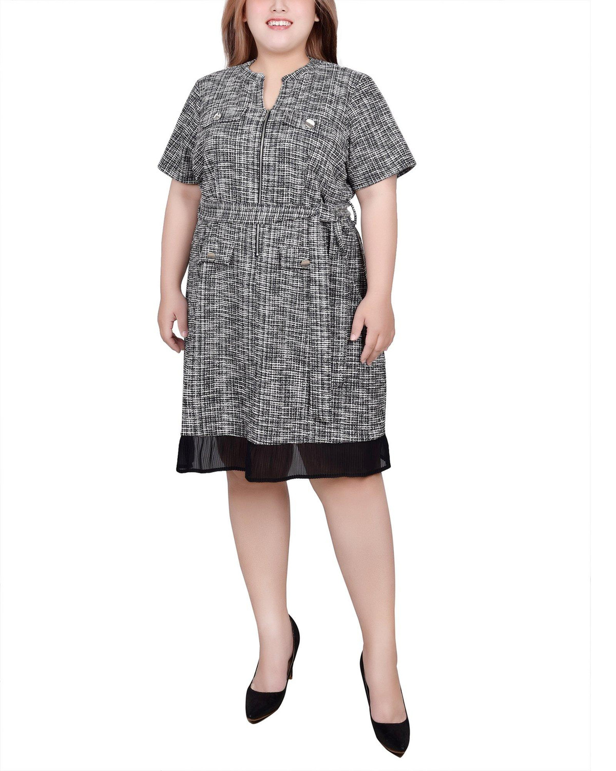 This short sleeve Plus NY Collection zip-front dress features a blend of fabrics, a zip front design for a modern look, a self-belt to define your figure, and sophisticated colorblocking with flap-pocket details. Its sleek silhouette pops with refinement, ensuring you look your best no matter the occasion.