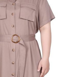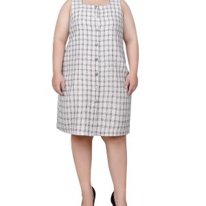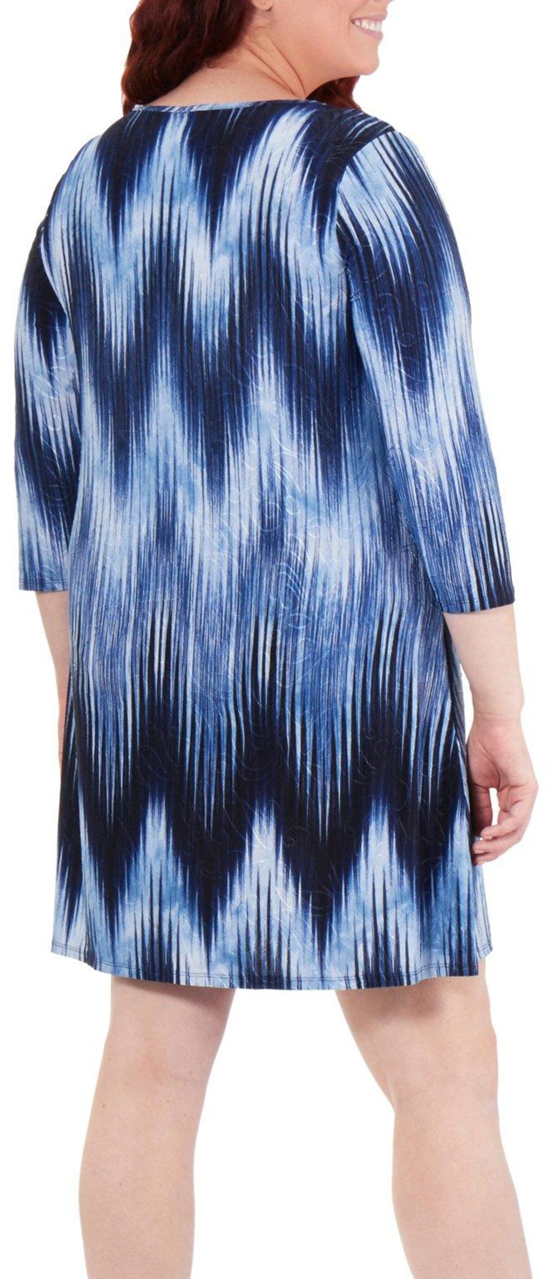 With an abstract chevron print, this plus size shift dress from NY Collection offers a decorative keyhole and 3/4 sleeves. Measures approximately 36“ in length.