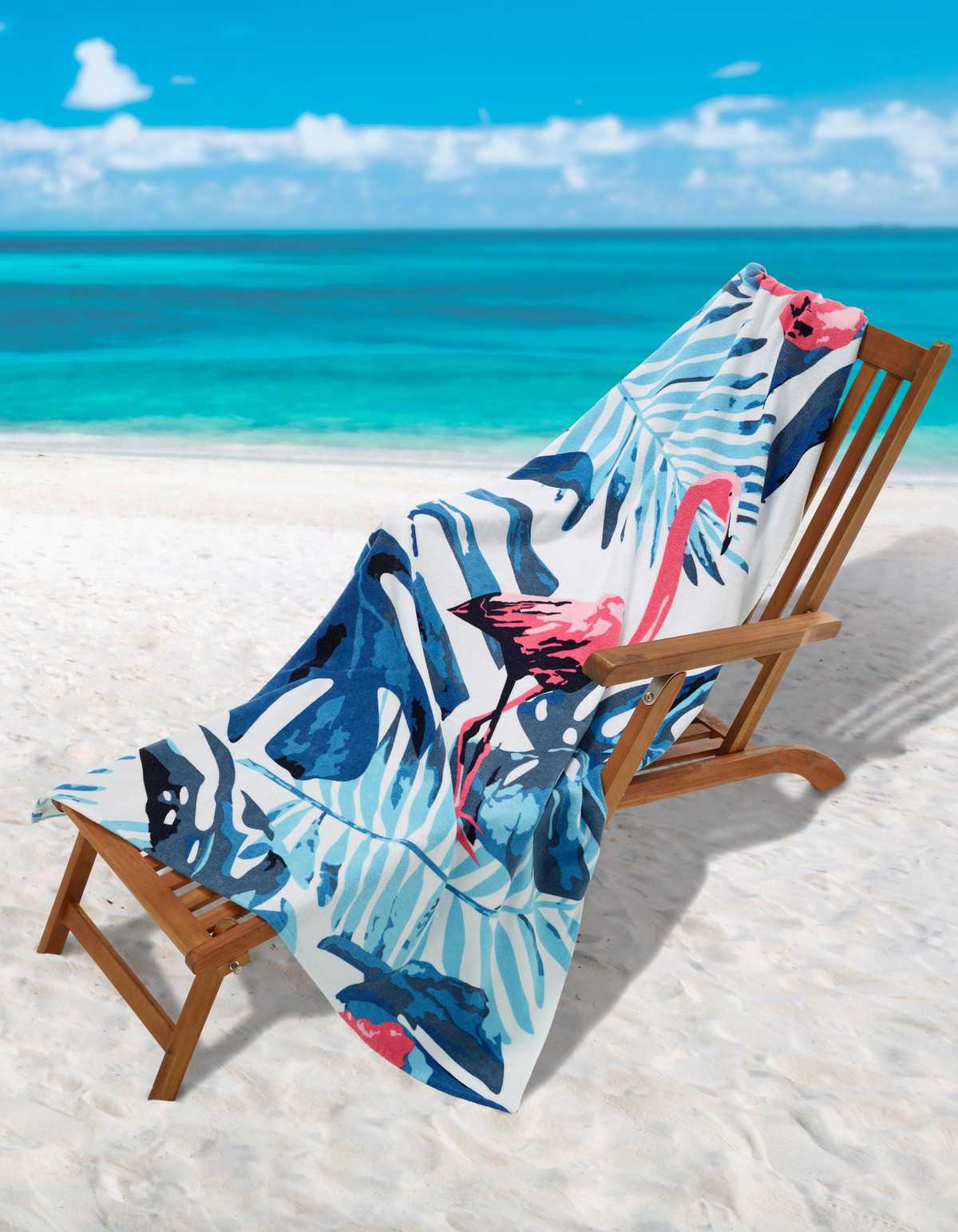 The Izod Oasis Beach Towel features a lush tropical scene with a pink flamingos, pink hibiscus, and a variety of tropical flora printed on an oversized white ground. 100% cotton sheared velour face, terry back, 40 x 70. The perfect addition to your day at the beach or pool!