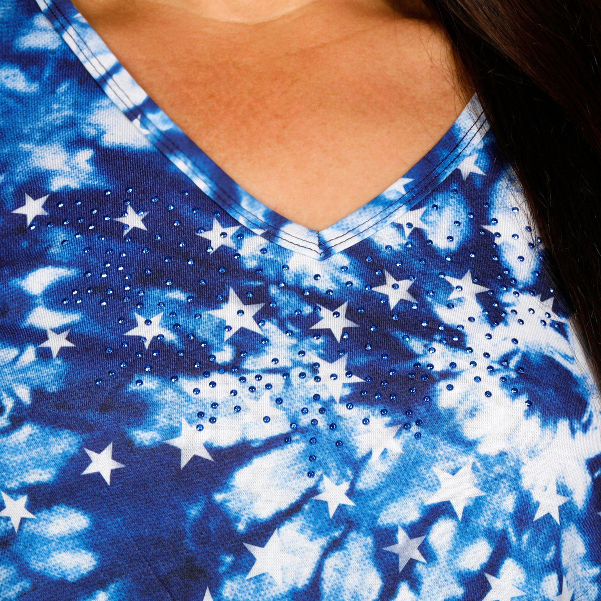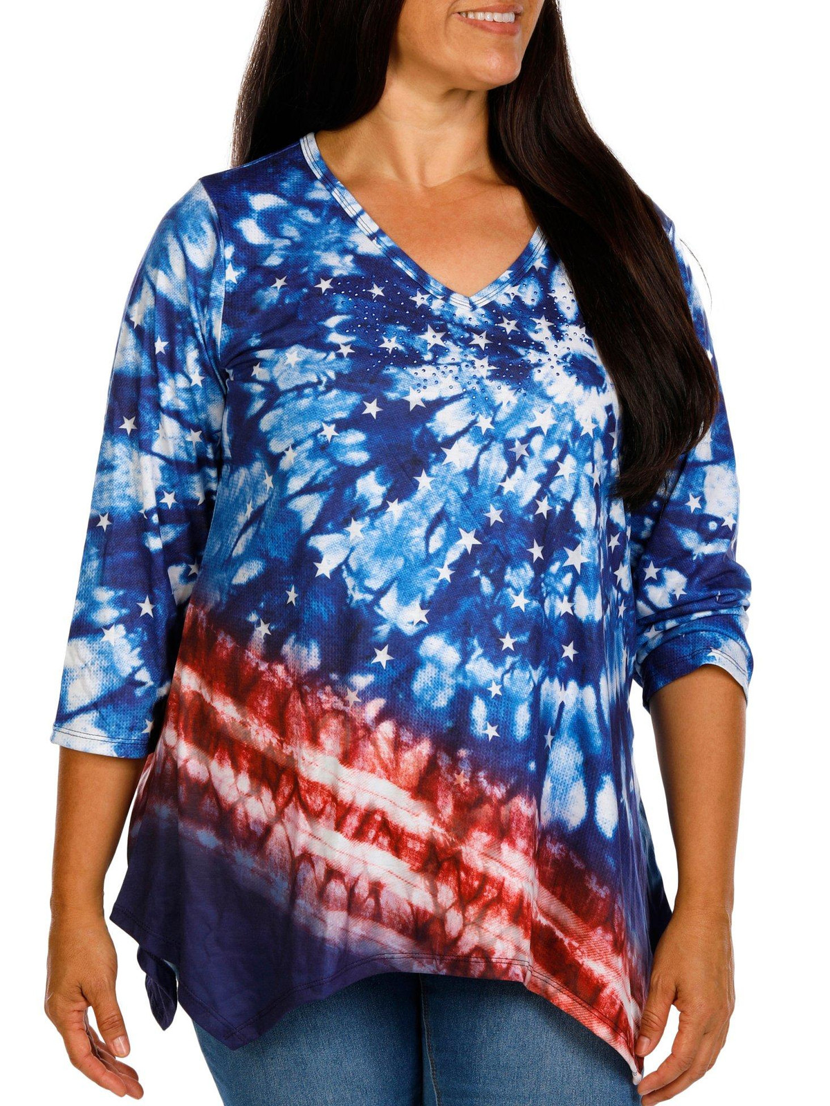 Celebrate in style with this plus size top featuring an American flag inspired tie dye design. Sparkling rhinestone embellishments add a festive touch while the v neckline and three quarter sleeves offer a flattering and comfortable fit. Fabrication 95% polyester, 5% spandex