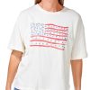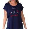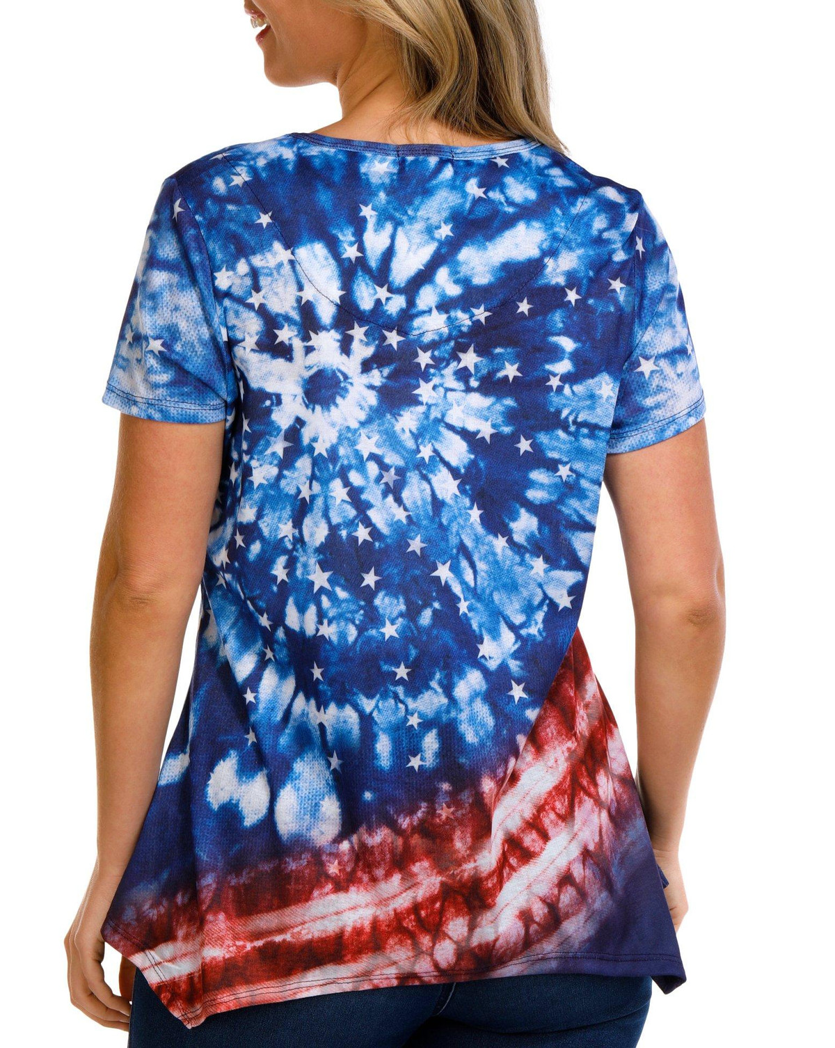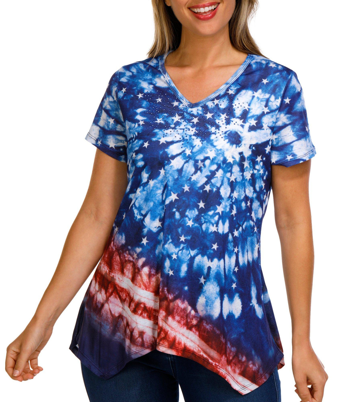 This short sleeve top features a print pattern on lightweight knit fabric, a v-neck collar, jewel embellishment, a hi-low hem, and relaxed styling. Fabrication is 100% polyester. Measures approximately 27 in.