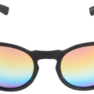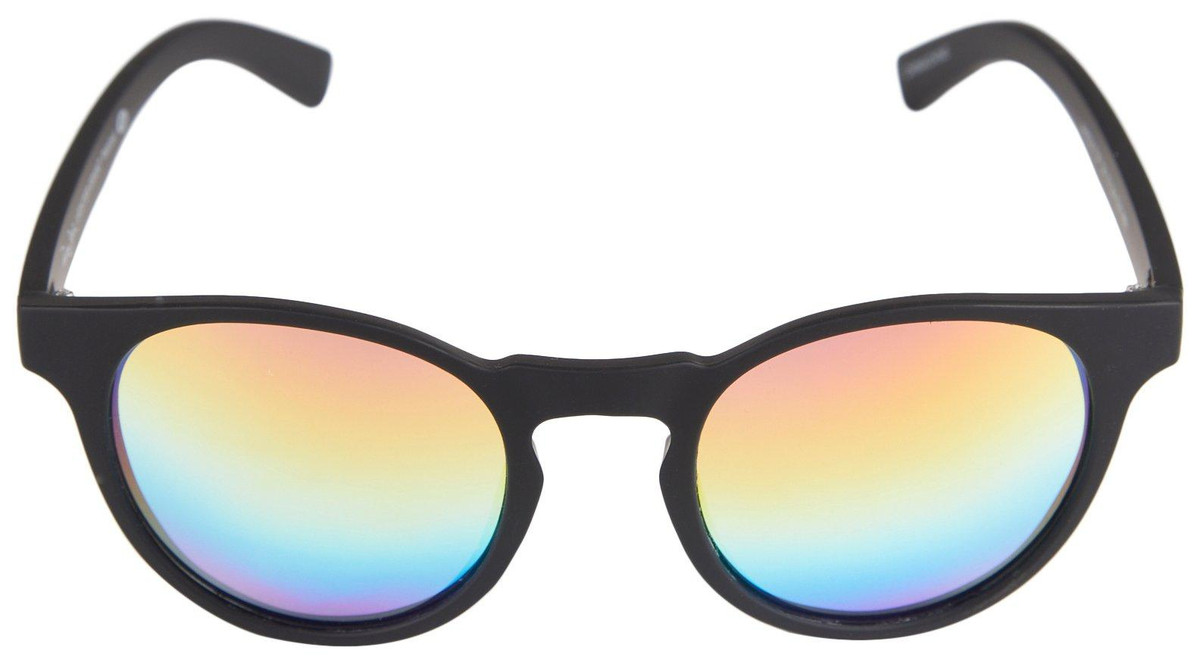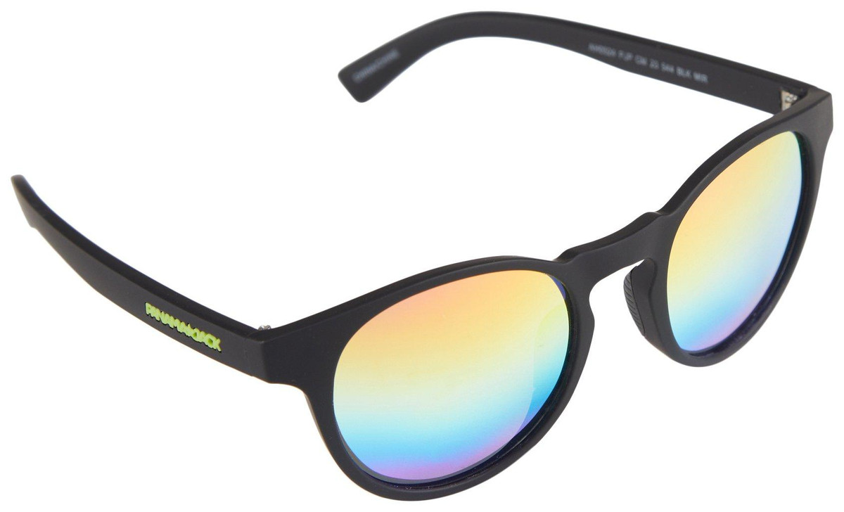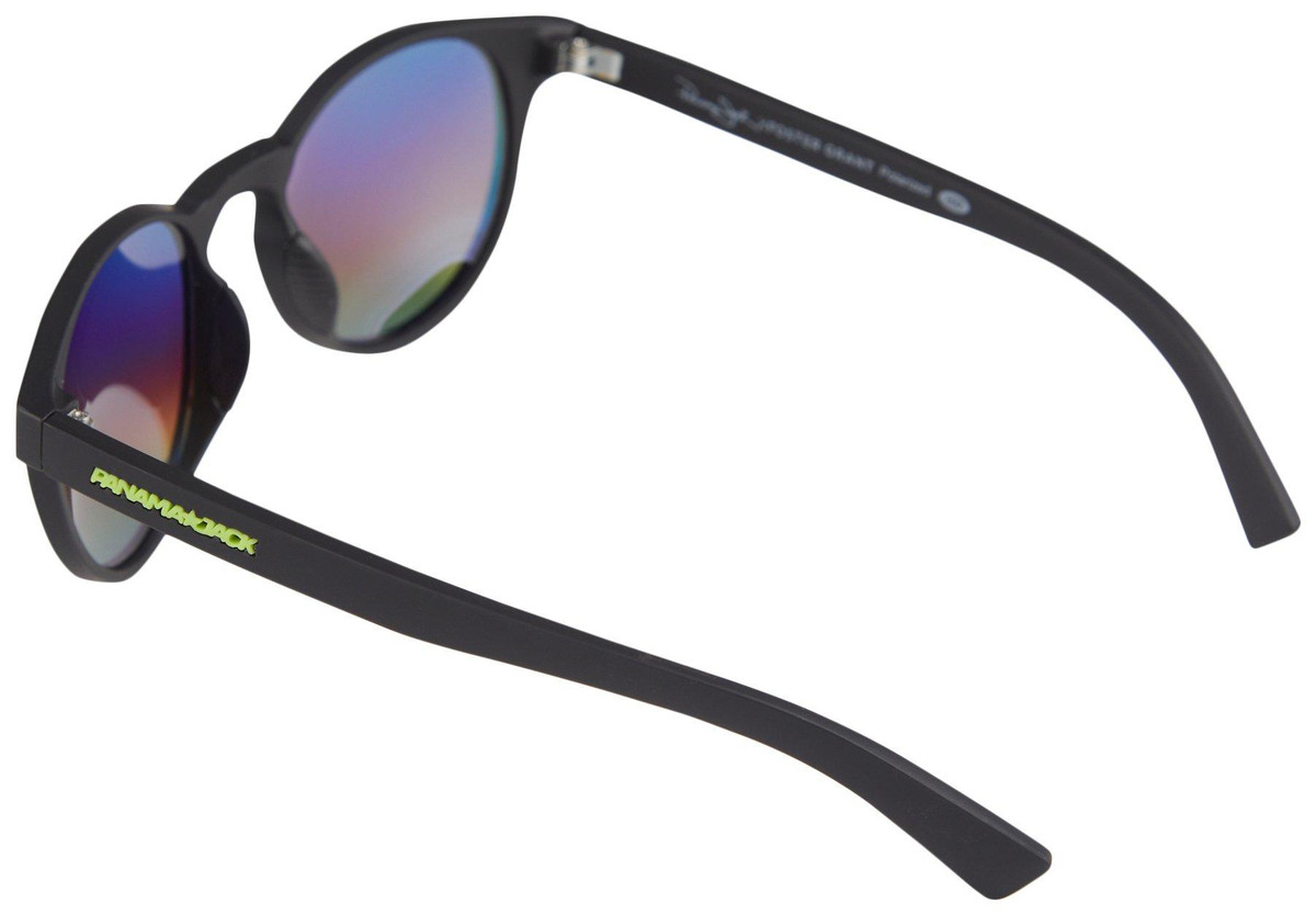 These sunglasses feature a black frame with round, rainbow mirrored, polarized lenses offering 100% UVA & UVB protection. The frame has a rubberized coating for comfort, and the Panama Jack logo is displayed in neon green on the temples.
