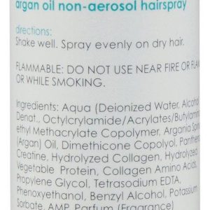 Fight frizz and lock in style with Argan Oil Non-Aerosol Hairspray. Infused with nourishing argan oil, this formula adds shine, holds softly, and protects against humidityleaving hair touchable, never stiff. Contains 3 oz.