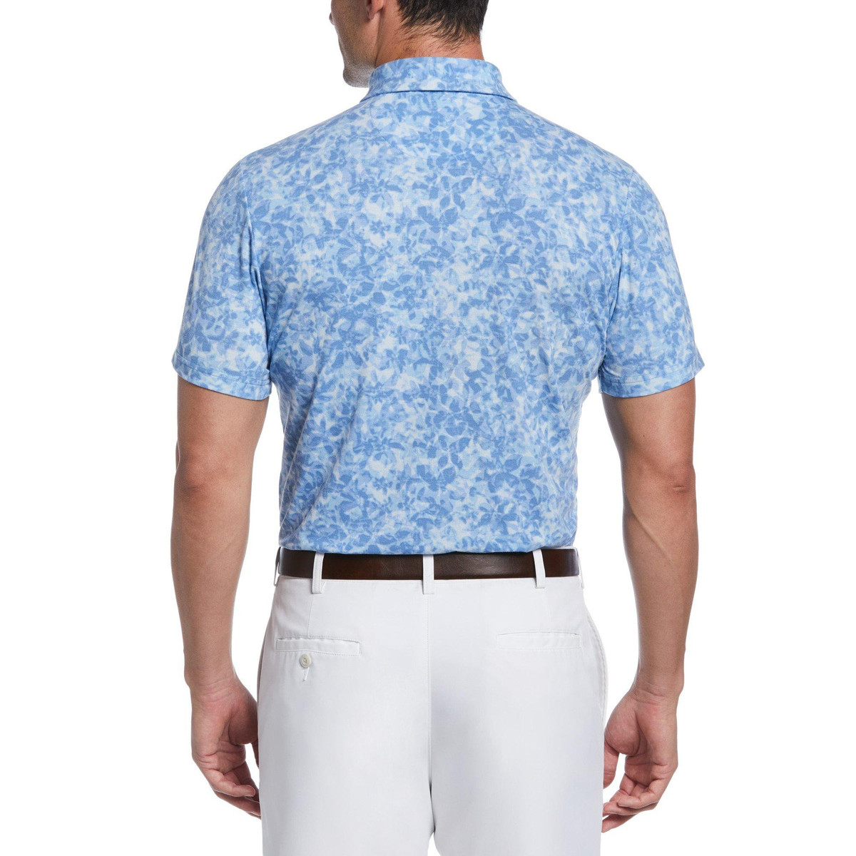 Perfect your backswing in style and comfort with the fresh floral print and moisture-wicking stretch fabric of this golf polo shirt. Fabrication is 92% polyester and 8% elastane.