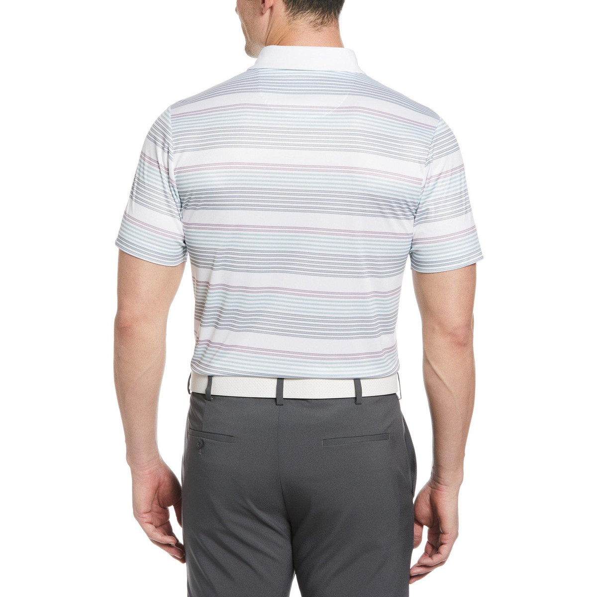 This mens golf polo is always a smart casual-wear choice. Interlock fabrication provides natural stretch for all-day comfort while the stretch shoulder seams allow for flexible freedom of movement. This short-sleeve golf shirt features an all-over energy stripe print for a fresh, fashionable look. Fabrication is 100% polyester.