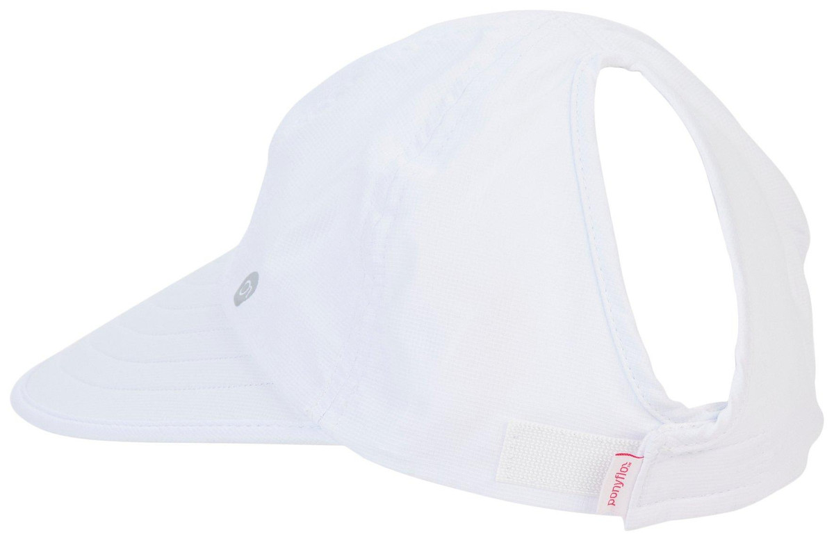 This cap features a solid color design on a lightweight polyester fabric, a large pre-curved visor, UV sun protection where skin is covered, quick dry fabric, and an adjustable self-adhesive back with large ponytail opening. One size fits most. Visor measures approximately 4 in.