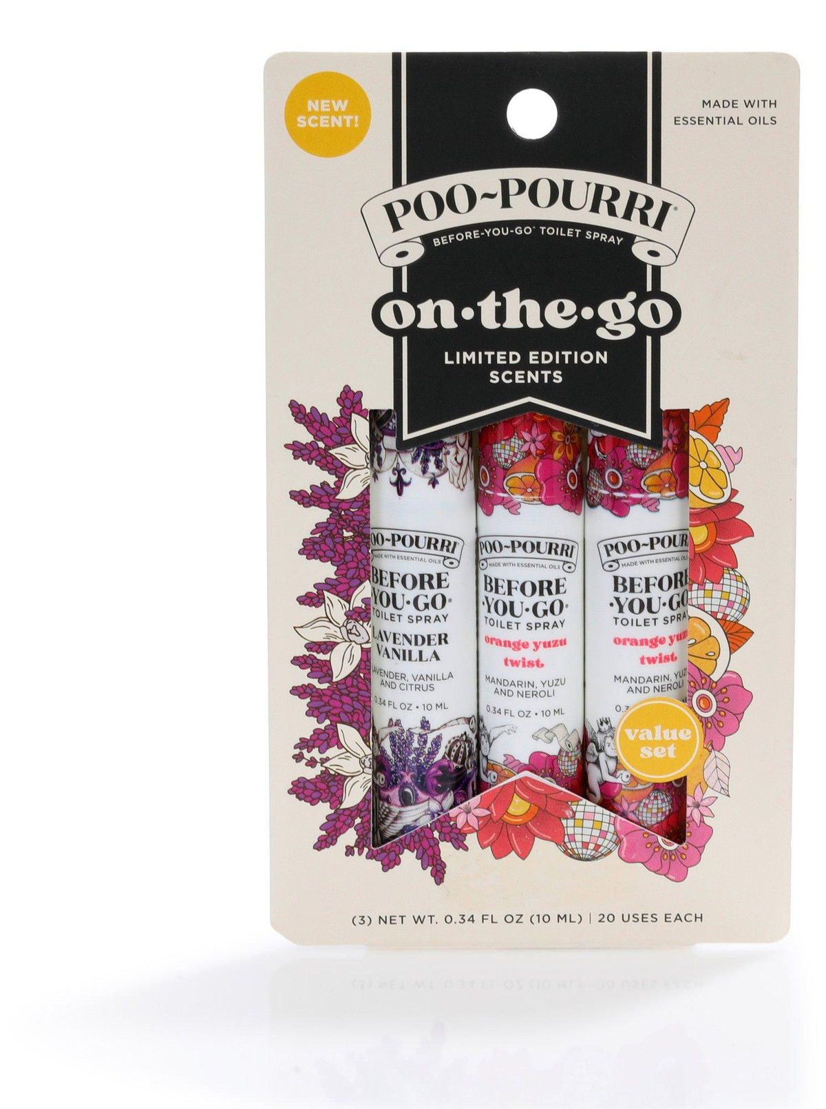 When you’re in a pinch and you’ve got to go, spritz the bowl first and no. This set includes Lavender Vanilla and Orange Yuzu Twist in travel-sized spray bottles. Travel confidently knowing each bottle is good for about 20 uses.