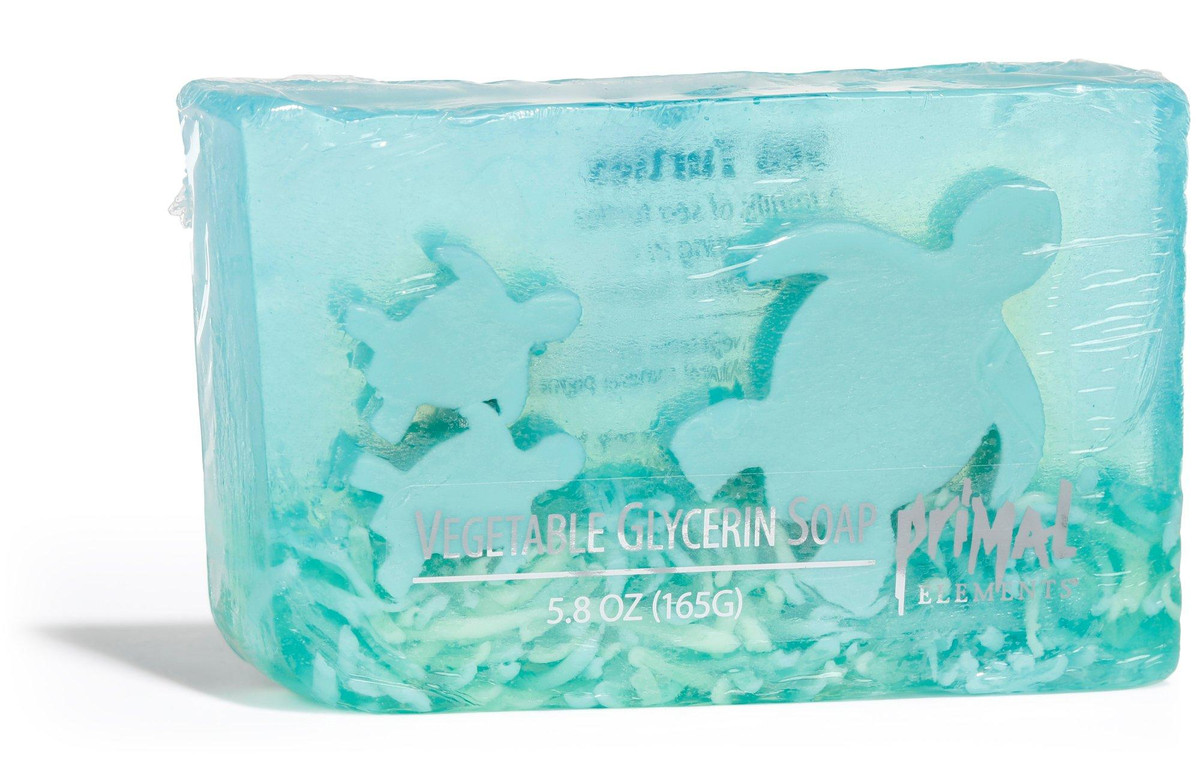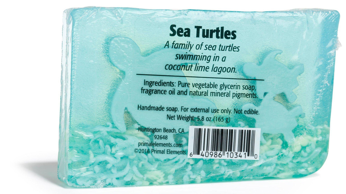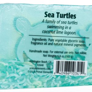 A family of sea turtles swimming in a coconut lime lagoon. When used as a face wash, glycerin soap will remove the excess oil from the skin to unclog pores. All of the unique designs, images and features inside our soaps are made with the same fabulous vegetable glycerin soap base formula. 5.8 oz. bar is shrink-wrapped and great for gift giving.
