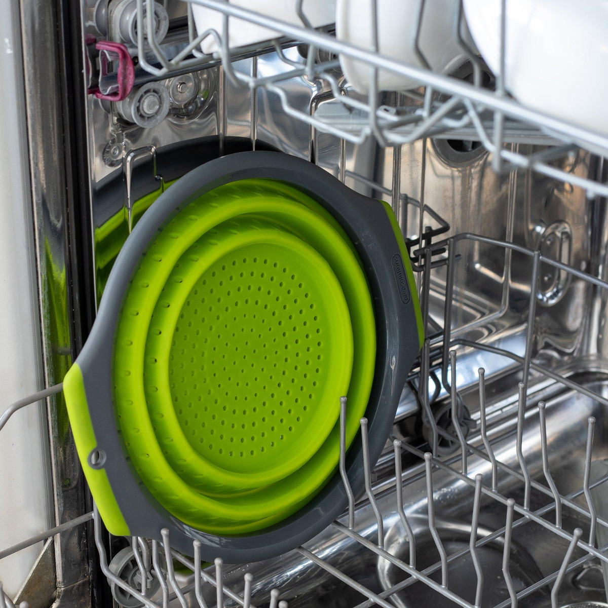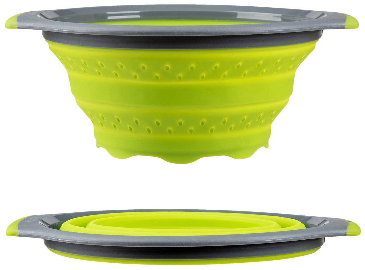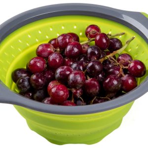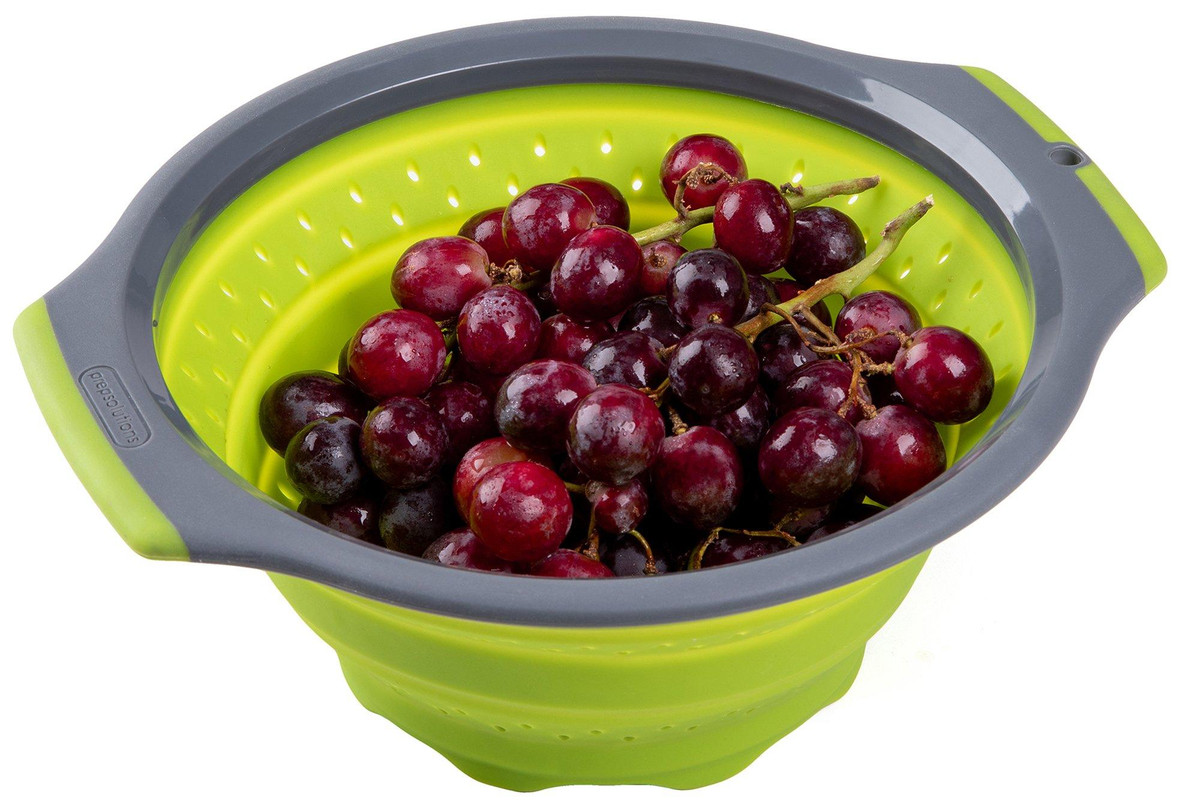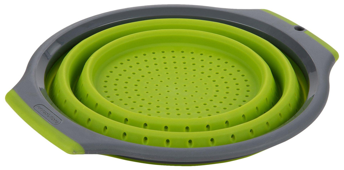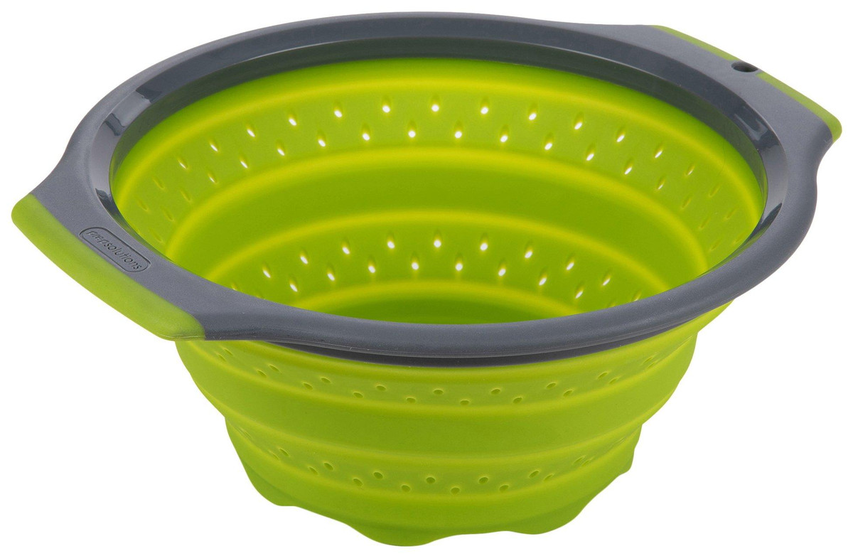 Wash and strain fruits, vegetables, pasta and more with this 3-Quart Silicone Collapsible Colander. This all-purpose colander is made with flexible silicone and can withstand both hot and cold liquids. It’s constructed with soft-grip handles for comfortable handling, raised feet for faster water draining and collapses to 1 inch for compact storage.