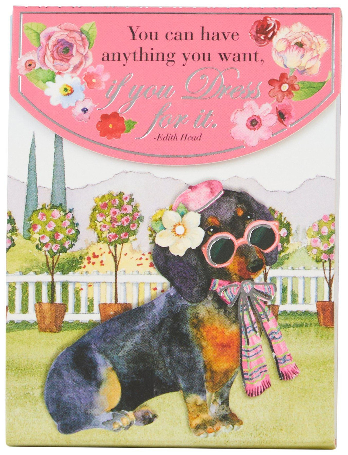 Bring a smile to every note with this compact magnetic-close notebook featuring a stylishly dressed dachshund on the cover. Its portable size and secure closure make it ideal for capturing ideas, lists, and quick thoughts anywhere. A delightful pick for dog lovers and notebook collectors. Measures 3 x 4 Inches.