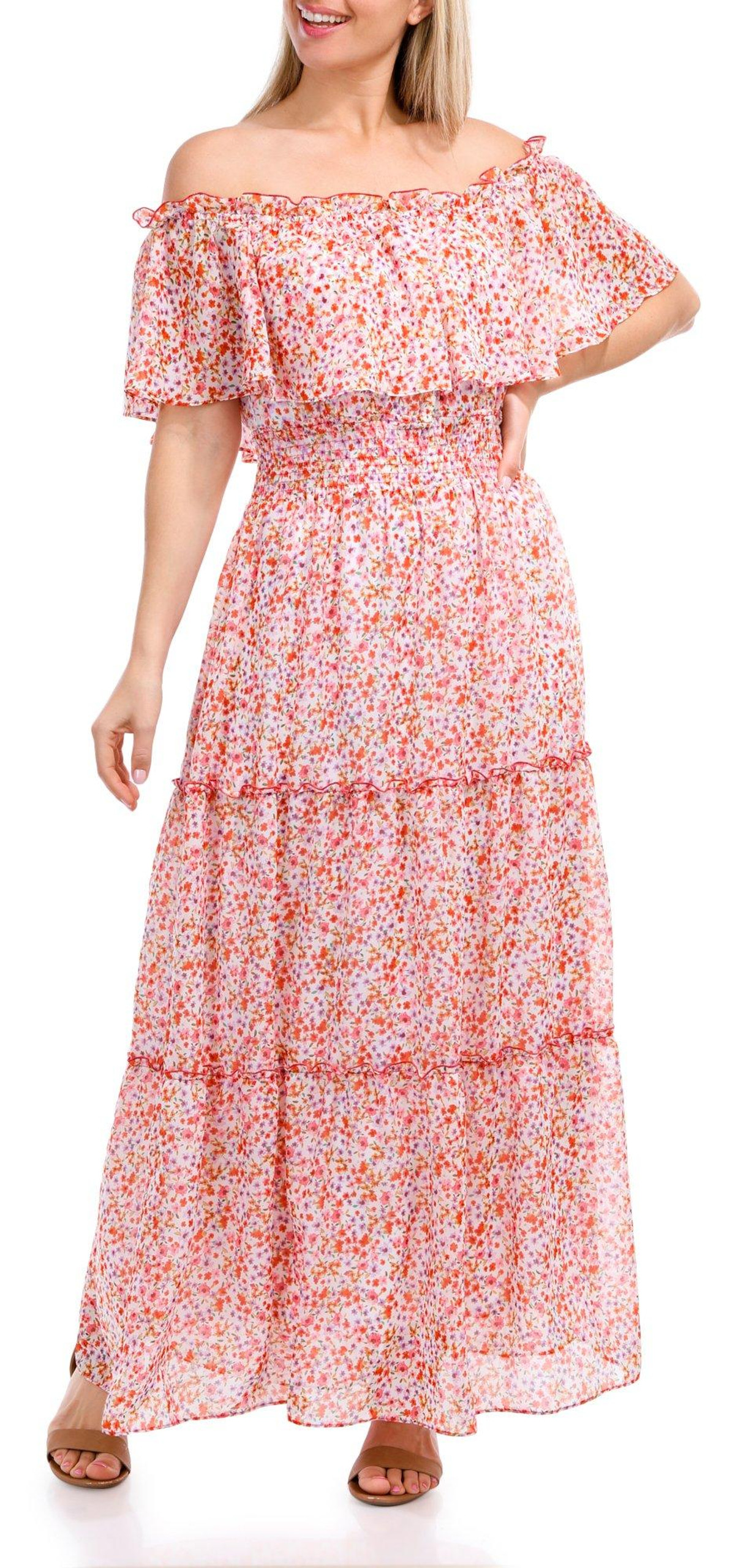 Elevate your style with the Off the Shoulder Floral Maxi Dress. This lined dress features a stunning floral print that exudes charm and sophistication. The off-the-shoulder design adds a touch of romance, perfect for any special occasion. Its flowing maxi length creates a graceful silhouette, while the comfortable lining ensures you feel as good as you look.