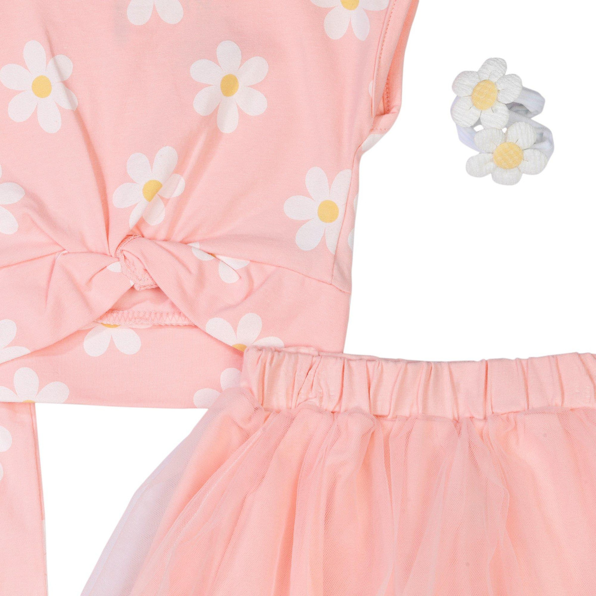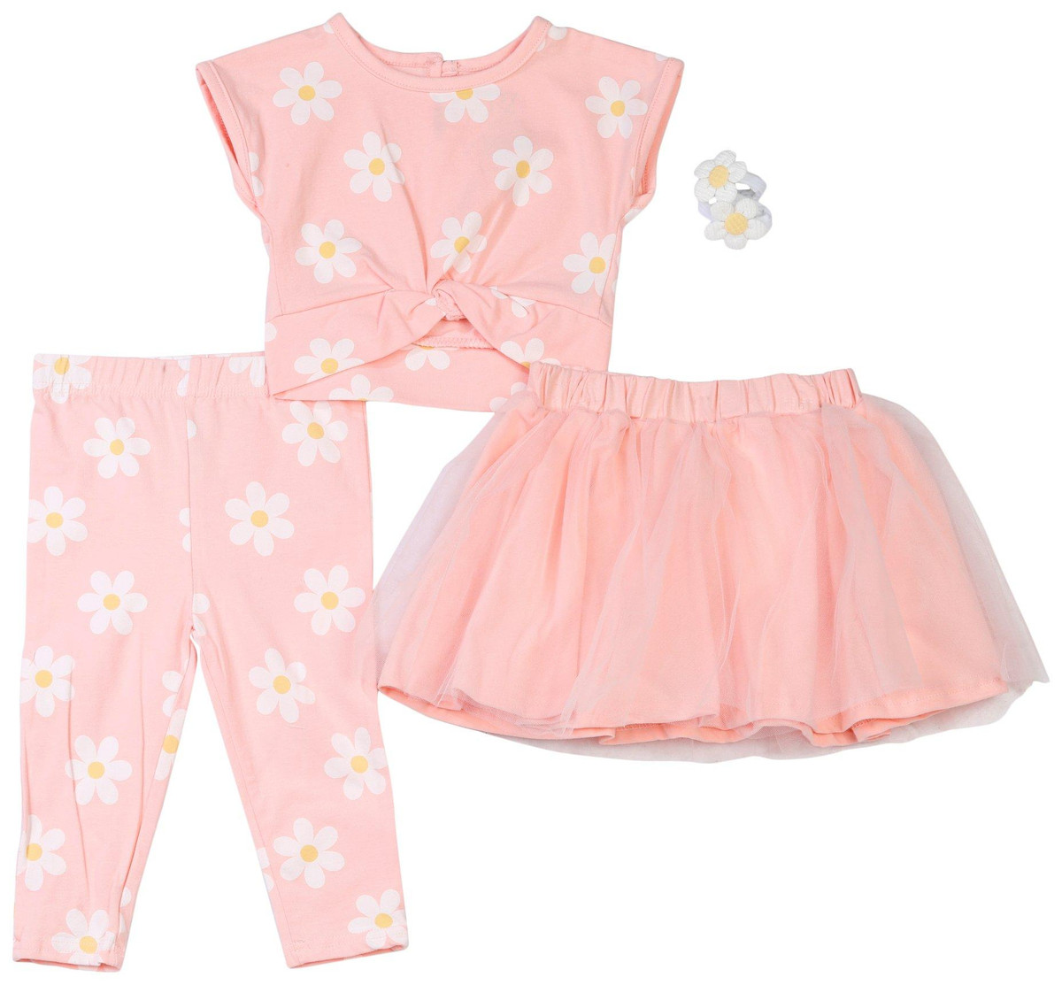 Add playful elegance to her wardrobe with this Baby Girls 4 Piece Daisy Tutu Skirt Set. Featuring a daisy floral pattern, the set includes a short sleeve shirt and matching pants in a soft cotton spandex blend, paired with a pink tutu and coordinating hair tie. Perfect for special occasions or dress-up fun. Machine wash cold for easy care.