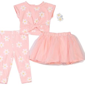 Add playful elegance to her wardrobe with this Baby Girls 4 Piece Daisy Tutu Skirt Set. Featuring a daisy floral pattern, the set includes a short sleeve shirt and matching pants in a soft cotton spandex blend, paired with a pink tutu and coordinating hair tie. Perfect for special occasions or dress-up fun. Machine wash cold for easy care.