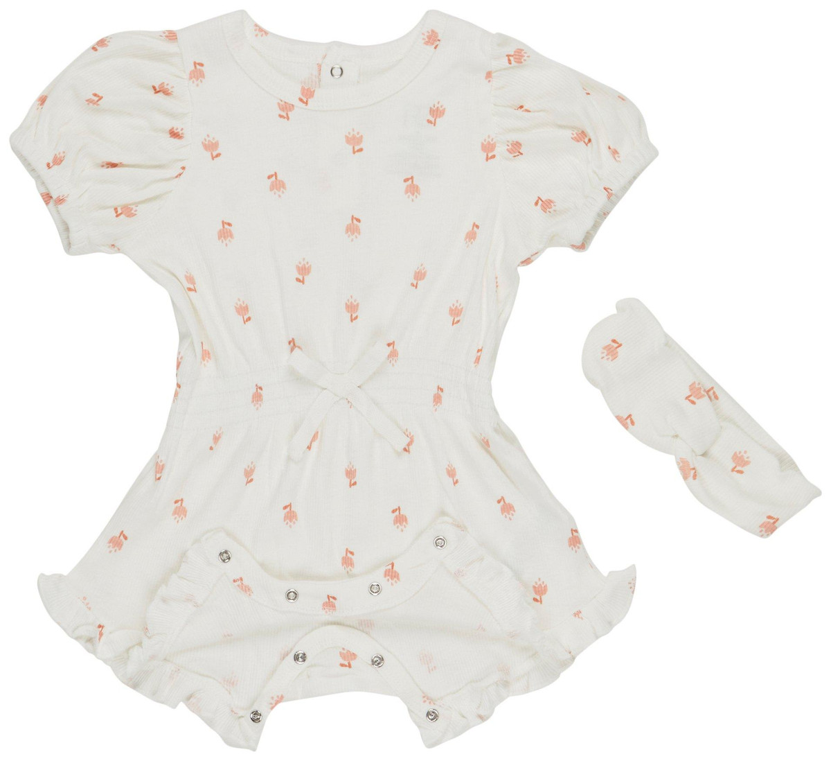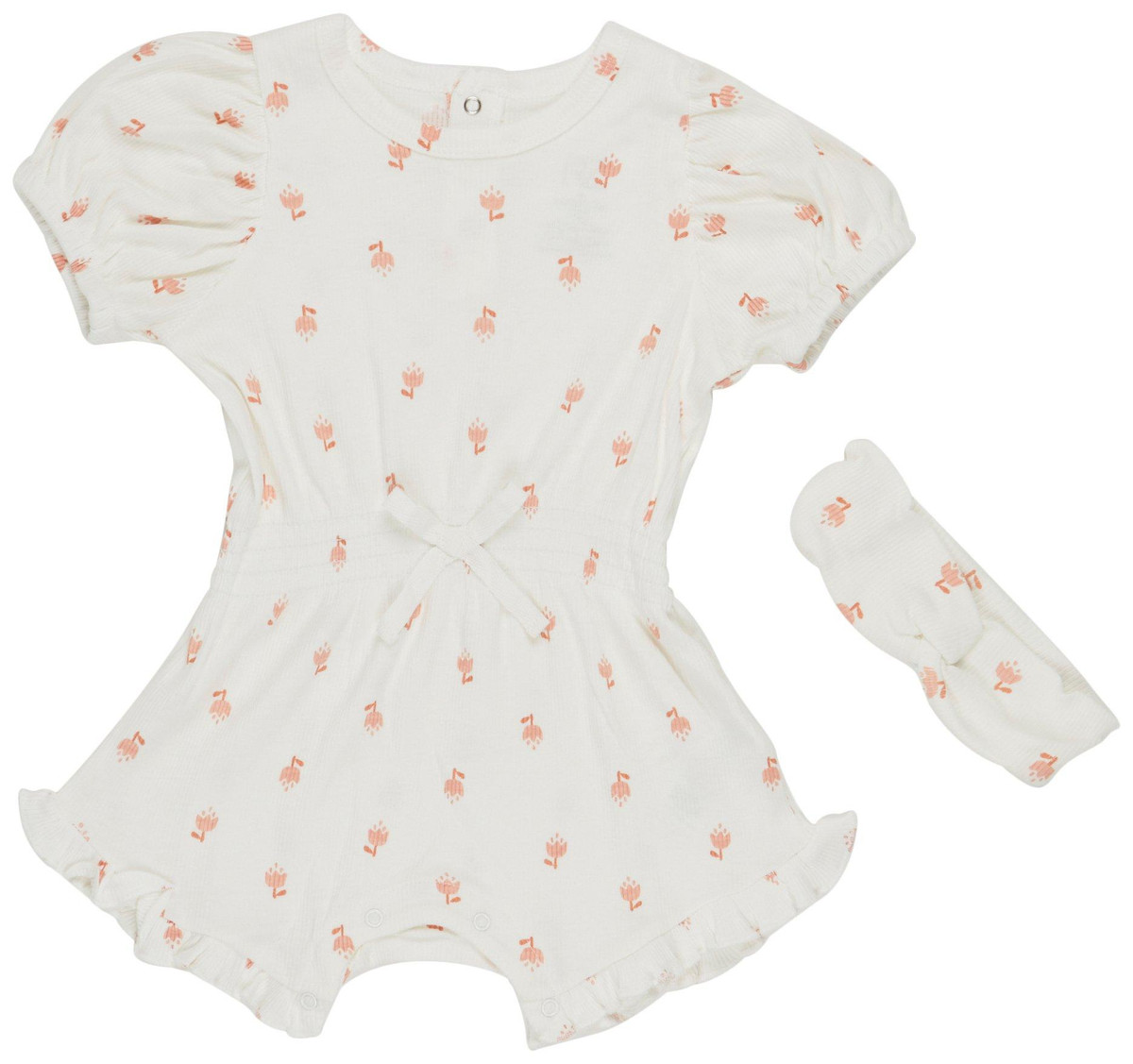 This charming two piece romper set is designed for both style and comfort making it a must have for modern moms. The soft white fabric is adorned with delicate pink tulip patterns creating a sweet and elegant look. Featuring an elastic waist for a perfect fit this romper allows easy movement for active little ones. The matching headband adds an adorable touch making it ideal for special occasions or everyday wear. Lightweight and breathable it keeps baby cozy and fashionable all day long.