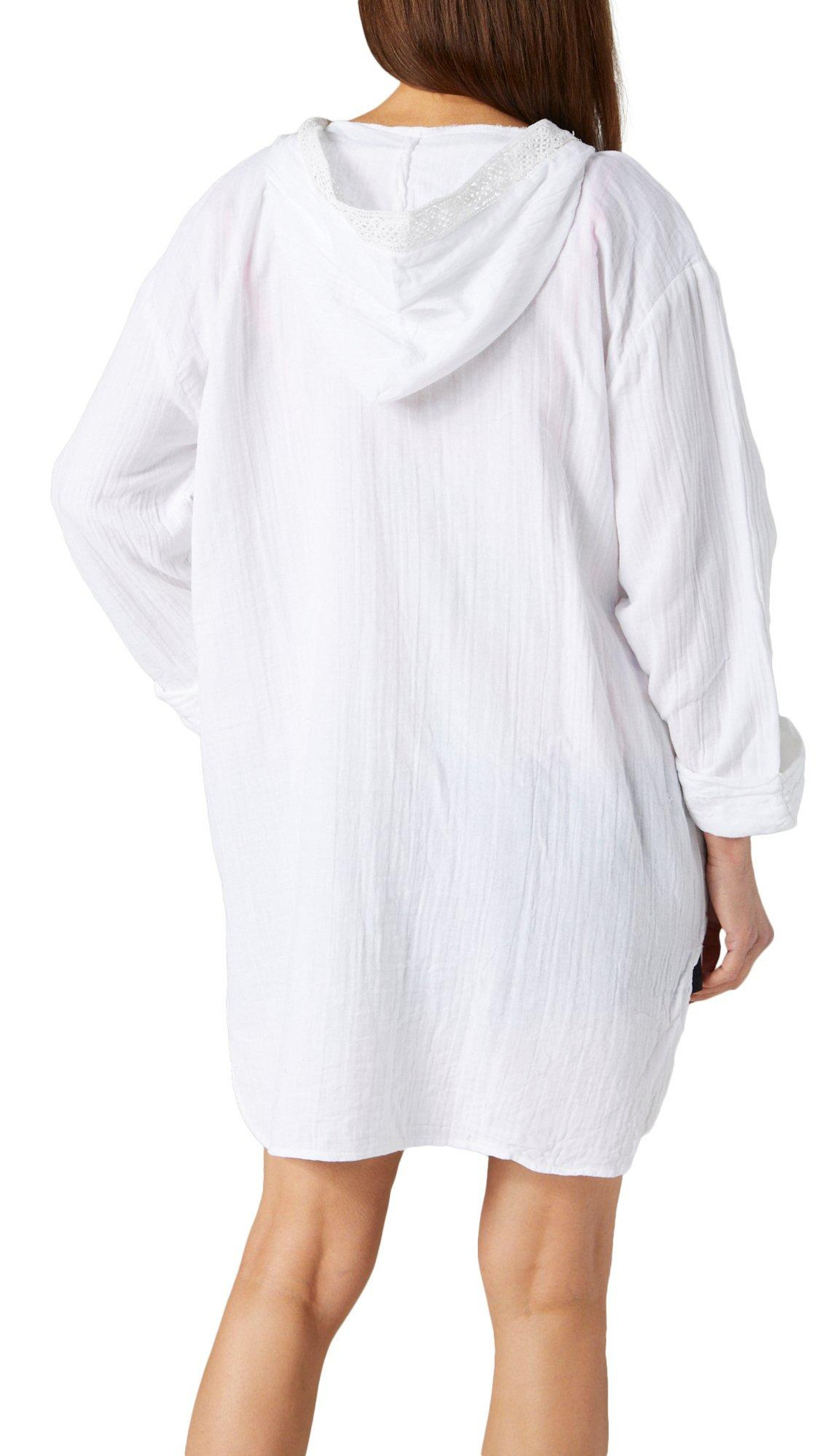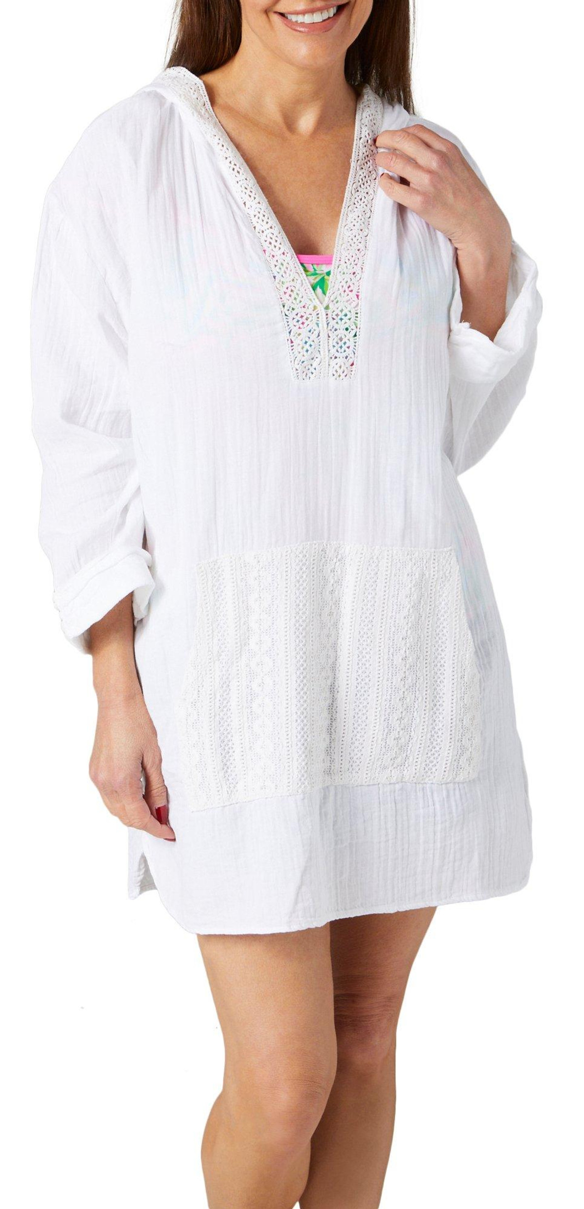 Introducing our Women’s 3/4 Sleeve Hooded Gauze Swim Cover Up, crafted from 100% cotton for a soft and breathable feel. This stylish cover-up features a solid color, a hooded neckline, crochet detailing on the front, and a convenient kangaroo pocket. Perfect for adding a touch of elegance and comfort to your beach or poolside look!