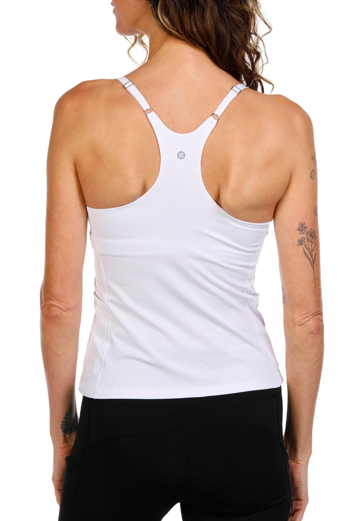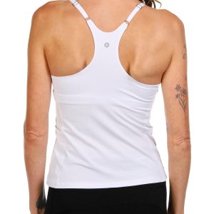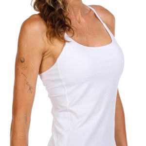 This bra tank features a solid color design on soft lightweight stretch knit and mesh fabric, scoop neckline, adjustable shoulder straps, racerback styling, two side pockets for smartphone or other valuables, form fitting, and removable soft cups. The top length measures approximately 23 in. Fabrication 92% recycled polyester, 8% spandex for the body, and 81% polyester, 19% spandex for the mesh.